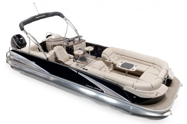 Ultra plush and heavy weight upholstery Roto-Cast furniture bases and backs Fun Zone : 2 seats in stern area with storage under, armrest and cup holders Removable bow gate seat Reclining captain's chair on slide and swivel 3 chaise lounges Storage in chaise lounges' reclined section Bar section including corner module, cooler storage, 12 volt outlet, and 4 stools Big storage under the Bar section Storage under all lounges Pop-up privacy enclosure Bow black pearl woodgrain pedestal mount snack table with drink holders