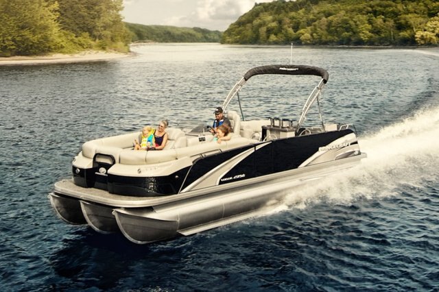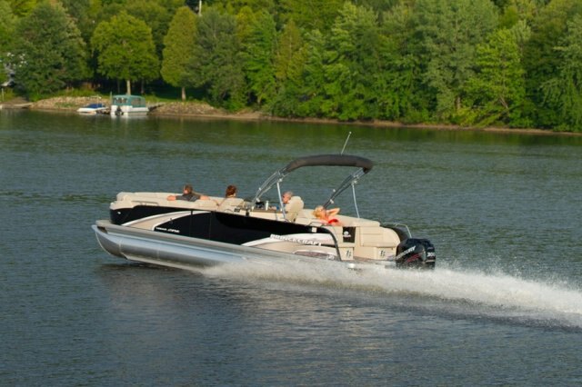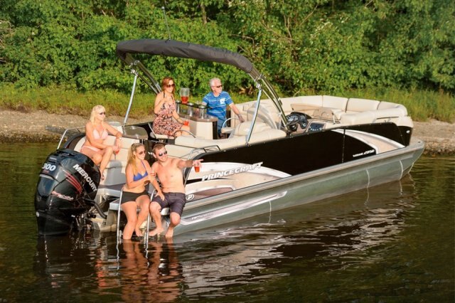 5052-H36 marine grade aluminum alloy NMMA & Transport Canada certified 2 ½" heavy-duty extruded Z-aluminum cross channels APS style side panels Sealed pontoon bulkheads with top mounted air plug (25") V-shaped aluminum engine pod Pressure-treated wood deck covered with marine grade carpet Extruded aluminum full-length pontoon keels Extruded aluminum full-length pontoon skirting Stern chromed corners Walk-thru bow gate with lift and lock hinges Walk-thru rear gate with lift and lock hinges Port side gate with lift and lock hinges Rear swim platform Bow molded section with integrated LED lighting Stainless steel bow eye Lifting eyes 4 stainless steel recessed cleats Gate holder