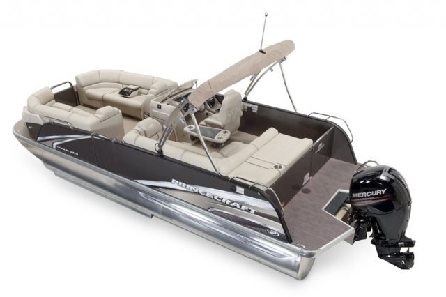 5052-H36 marine grade aluminum alloy NMMA & Transport Canada certified 2 ½" heavy-duty extruded Z-aluminum cross channels APS style side panels Sealed pontoon bulkheads with top mounted air plug (25") V-shaped aluminum engine pod Pressure-treated wood deck covered with marine grade carpet Extruded aluminum full-length pontoon keels Extruded aluminum full-length pontoon skirting Stern chromed corners Rear reclining padded sundeck Walk-thru bow gate with lift and lock hinges Walk-thru rear gate with lift and lock hinges Port side gate with lift and lock hinges Rear swim platform Bow molded section with integrated LED lighting Stainless steel bow eye Lifting eyes 4 stainless steel recessed cleats Gate holder