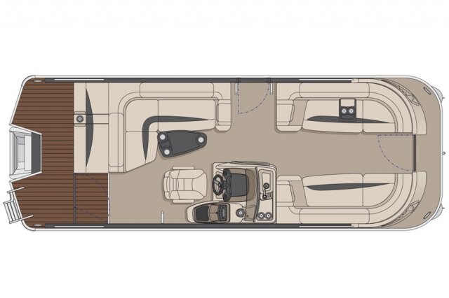 Helm console with galley unit including sink, faucet with electric pump and portable water tank Molded dash panel with woodgrain inserts and lighted switches Sport tilt steering mechanism Clarion Radio CMS2 compatible MP3, WMA, MP4, Bluetooth, Pandora, SiriusXM, and USB 4 waterproof speakers ( 6 ½" ) Lowrance depth finder gauge with water temperature Electric horn 12V outlet Push on/off console courtesy light LED lighting under driver console Smoked windscreen
