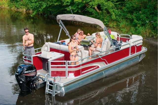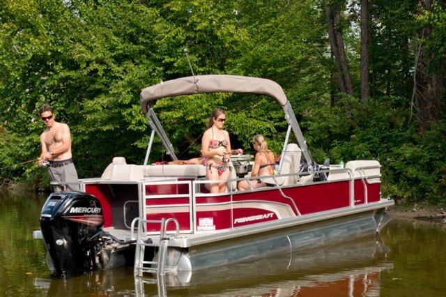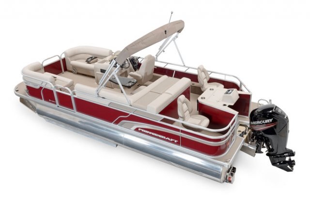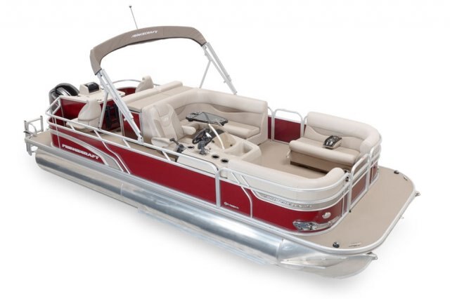5052-H36 marine grade aluminum alloy NMMA & Transport Canada certified 2 ½" heavy-duty extruded Z-aluminum cross channels 1 1/4" anodized aluminum rails Sealed pontoon bulkheads with top mounted air plug (25") V-shaped aluminum engine pod Pressure-treated wood deck covered with marine grade carpet Extruded aluminum full-length pontoon keels Extruded aluminum full-length pontoon skirting Stern chromed corners Rear padded sundeck Walk-thru bow gate with lift and lock hinges Walk-thru rear gate with lift and lock hinges Port side gate with lift and lock hinges Stainless steel bow eye Lifting eyes 2- 6" stainless steel deck cleats 2 stainless steel recessed cleats