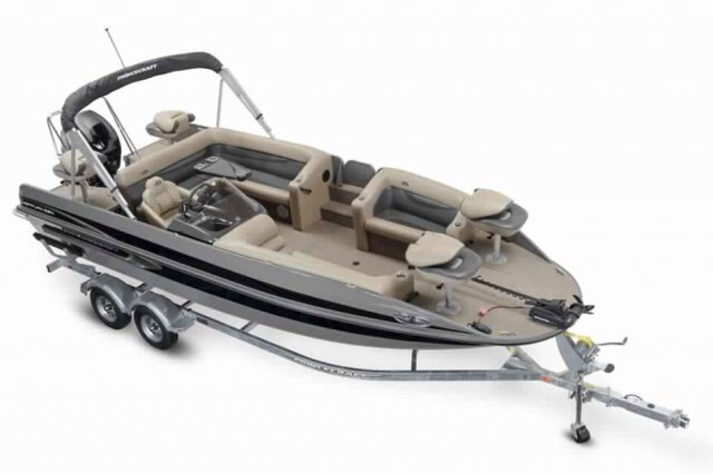 5052-H36 marine grade aluminum alloy NMMA & Transport Canada certified Pressure treated wood deck covered w/ marine grade carpet (20 oz) High gloss exterior High Solids urethane paint and decal package High performance deep Vee reverse chine hull design Stainless steel bow eye 4 chromed cleats (6") Side panel rigging tubes from stern to console and console to bow Rear boarding access Built-in floor cooler In-floor lockable ski storage compartment Anchor storage