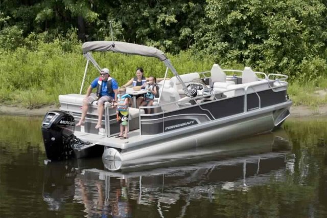 5052-H36 marine grade aluminum alloy NMMA & Transport Canada certified 2 ½" heavy-duty extruded Z-aluminum cross channels 1 1/4" anodized aluminum rails Sealed pontoon bulkheads with top mounted air plug (25") V-shaped aluminum engine pod Pressure-treated wood deck covered with marine grade carpet Extruded aluminum full-length pontoon keels Extruded aluminum full-length pontoon skirting Stern molded corners Rear padded sundeck Walk-thru bow gate with lift and lock hinges Walk-thru rear gate with lift and lock hinges Port side gate with lift and lock hinges Rear swim platform Stainless steel bow eye Lifting eyes 2- 6" stainless steel deck cleats 2 stainless steel recessed cleats