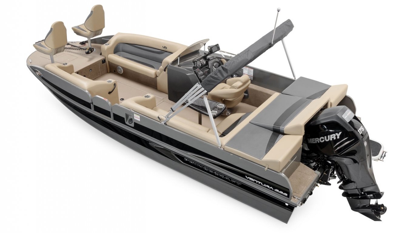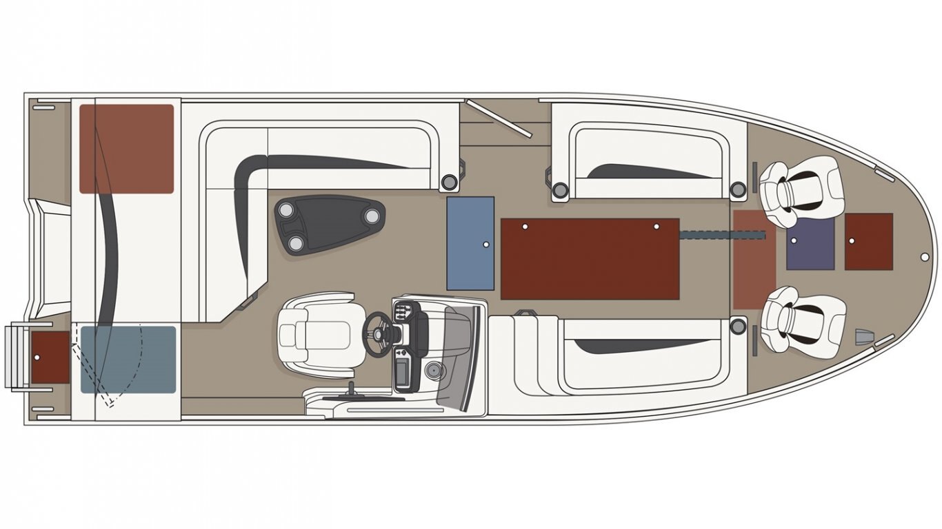 This 22’-2’’ aluminum deck boat can comfortably sit up to 12 and be powered by an engine ranging from 150 to 200 HP. With its 174 L (46 U.S. gal.) gas tank, its full-width rear padded sundeck, its chaise lounge, its 2 folding seats, a large electric-filled aerated livewell, and a lockable rod storage compartment, it is the ideal deck boat to go fishing or just cruising!