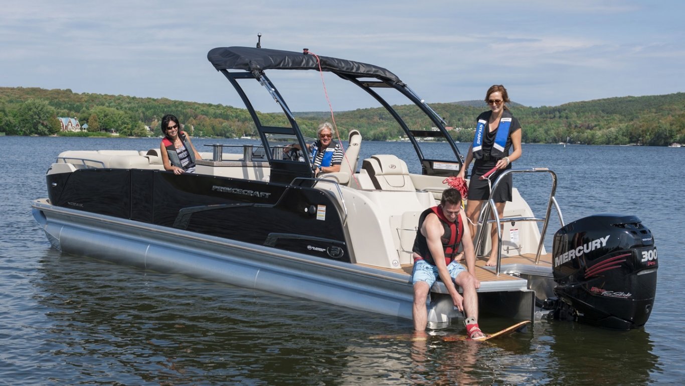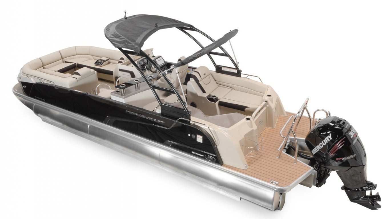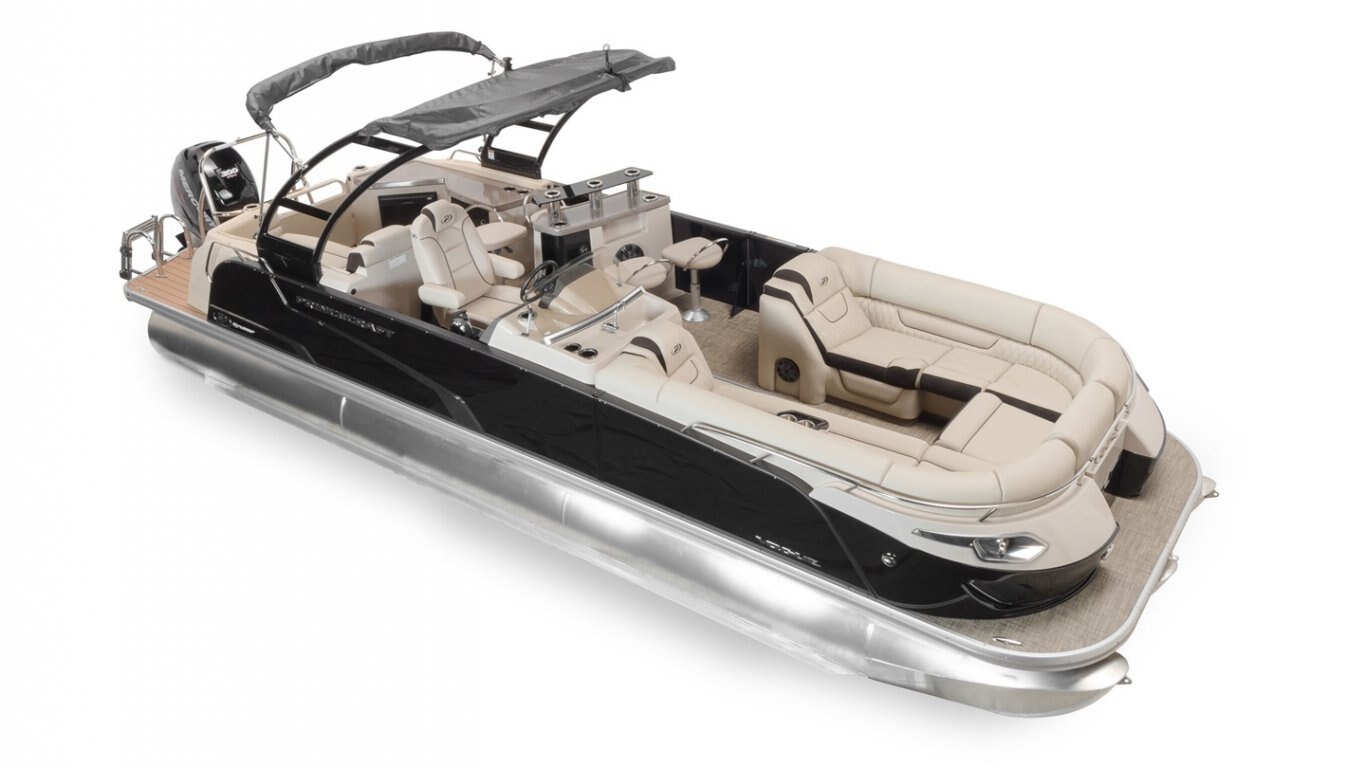 5052-H36 marine grade aluminum alloy NMMA & Transport Canada certified 2 ½" heavy-duty extruded Z-aluminum cross channels APS style side panels Sealed pontoon bulkheads with top mounted air plug (25") V-shaped aluminum engine pod Pressure-treated wood deck covered with marine grade carpet Extruded aluminum full-length pontoon keels Extruded aluminum full-length pontoon skirting Stern molded corners Walk-thru rear gate with lift and lock hinges Walk-thru bow gate with lift and lock hinges Port side gate with lift and lock hinges (20'') Rear swim platform Bow fiberglass molded section with integrated LED lighting Stainless steel bow eye 4 stainless steel recessed cleats