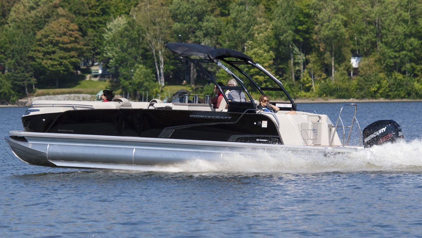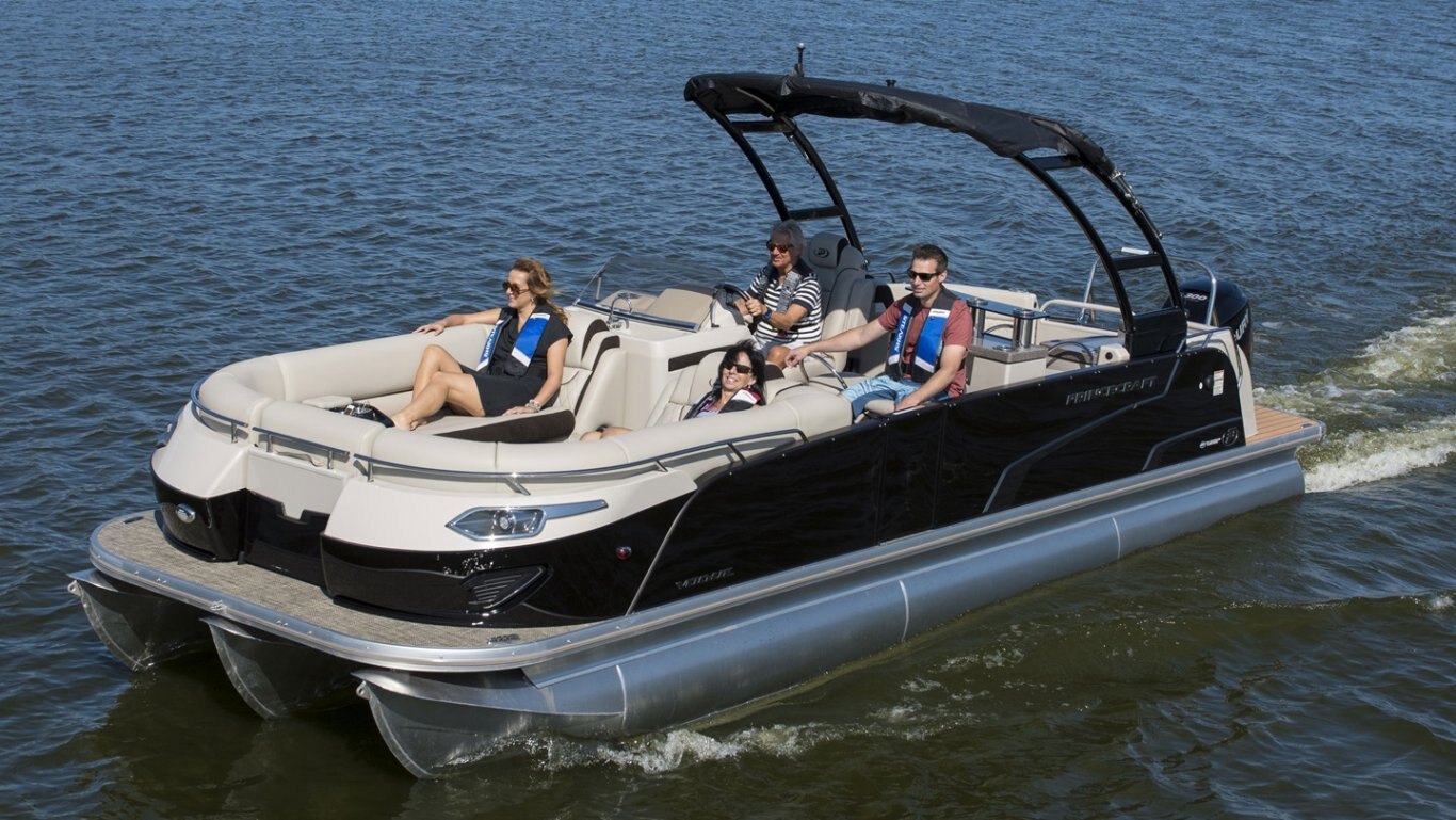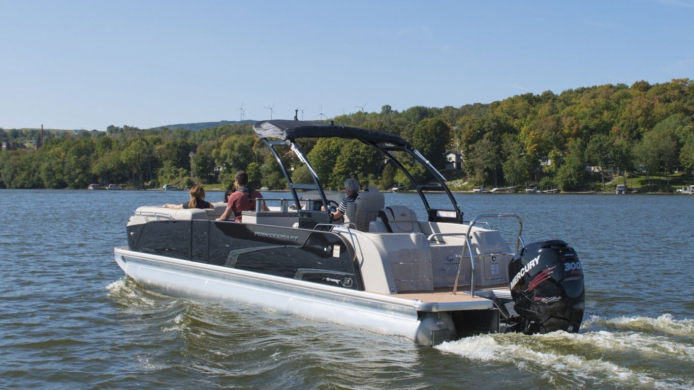 5052-H36 marine grade aluminum alloy NMMA & Transport Canada certified 2 ½" heavy-duty extruded Z-aluminum cross channels APS style side panels Sealed pontoon bulkheads with top mounted air plug (25") V-shaped aluminum engine pod Pressure-treated wood deck covered with marine grade carpet Extruded aluminum full-length pontoon keels Extruded aluminum full-length pontoon skirting Stern molded corners Walk-thru rear gate with lift and lock hinges Walk-thru bow gate with lift and lock hinges Port side gate with lift and lock hinges (20'') Rear swim platform Bow fiberglass molded section with integrated LED lighting Stainless steel bow eye 4 stainless steel recessed cleats