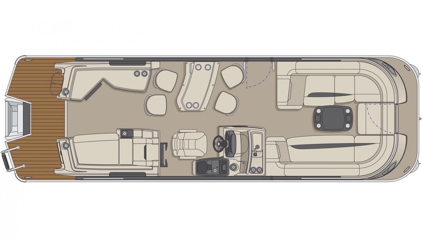 This 27’-11’’ pontoon features all the comfort and convenience you enjoy at home… and more. Aft bar section with corner module including refrigerator, cooler storage, 12 volt outlet, 4 adjustable stools, lots of storage, a galley with a sink and faucet, water tank (portable), ultra-plush upholstery, chaise lounges, radio, a swim platform and so much more. Have a party with up to 13 friends or enjoy your favorite water sports. Rig your pontoon with an engine from 150 up to 400 HP with the standard Performance Configuration and get ready for some serious fun!