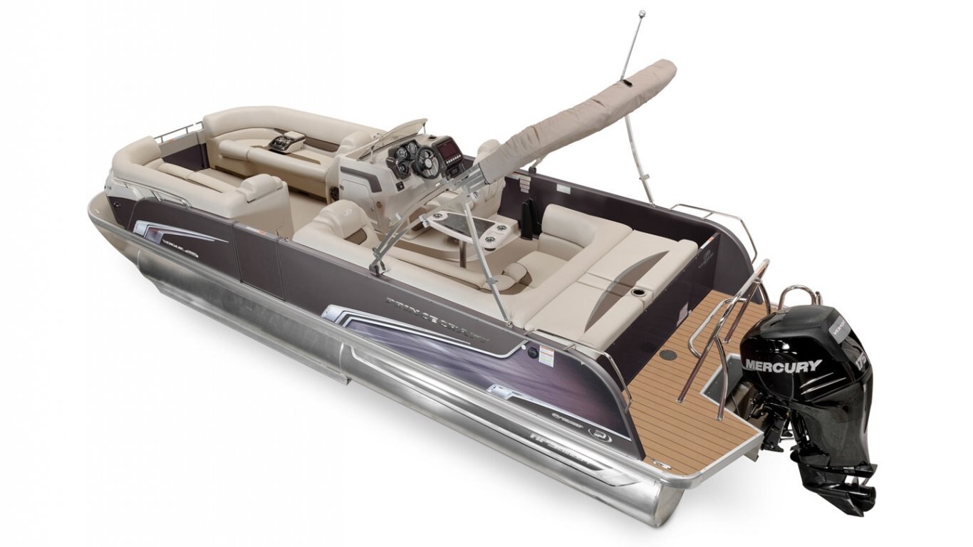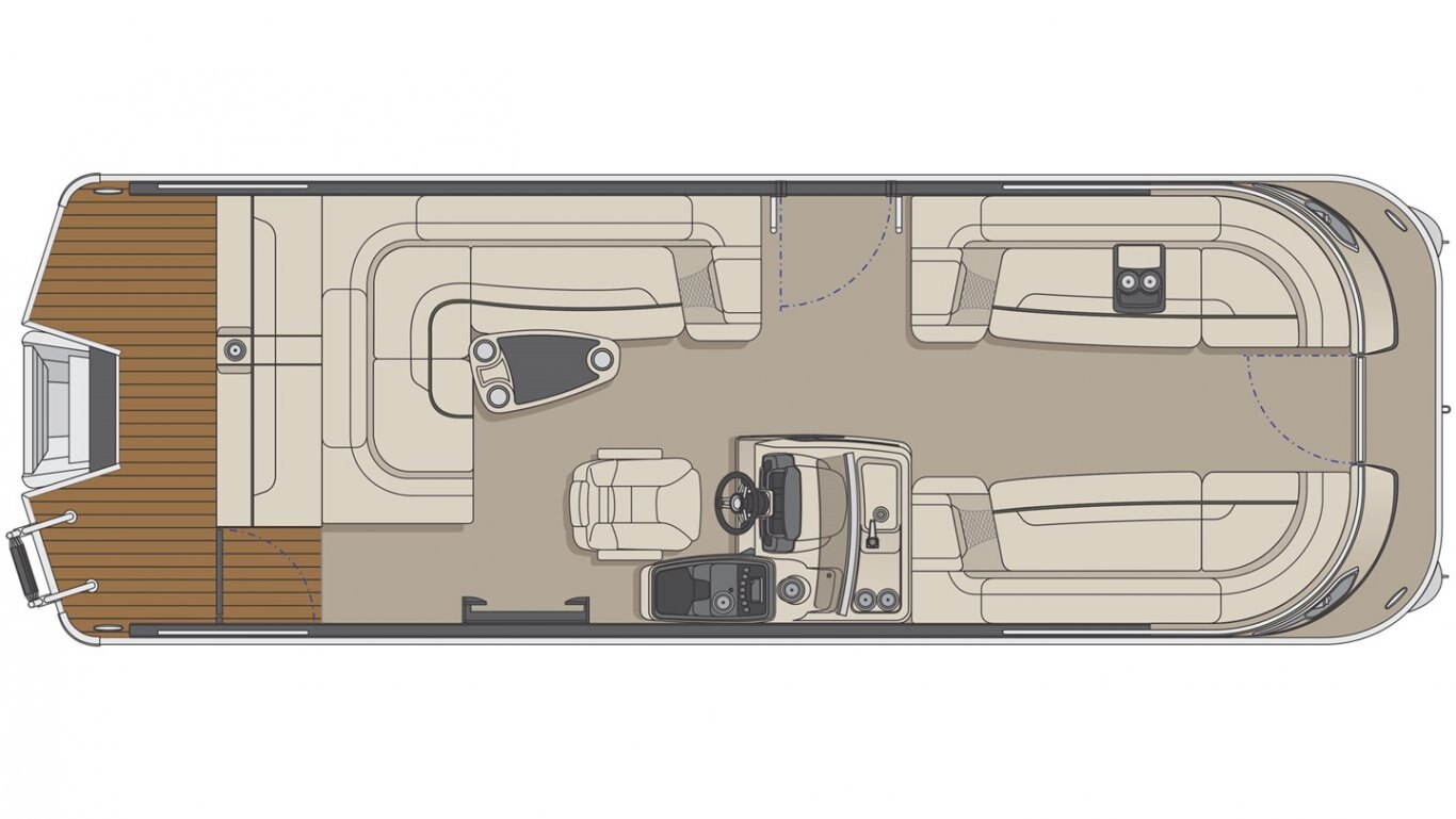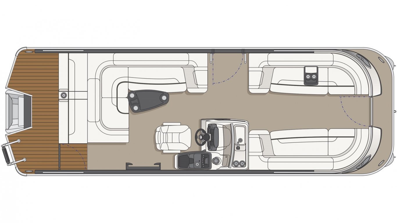 This 25’-11’’ pontoon features all the comfort and convenience you enjoy at home… and more. A galley with a sink and faucet, water tank (portable), rear reclining padded sundeck, rear swim platform, ultra-plush upholstery, chaise lounges, radio, and so much more. Have a party with up to 12 friends or enjoy your favorite water sports. Rig your pontoon with an engine up to 300 HP (with the optional Performance Configuration) and get ready for some serious fun!