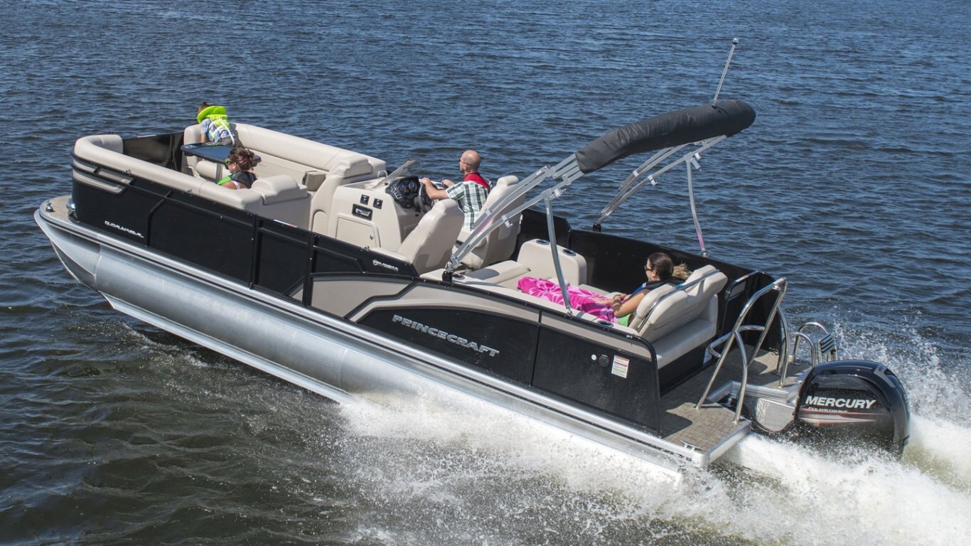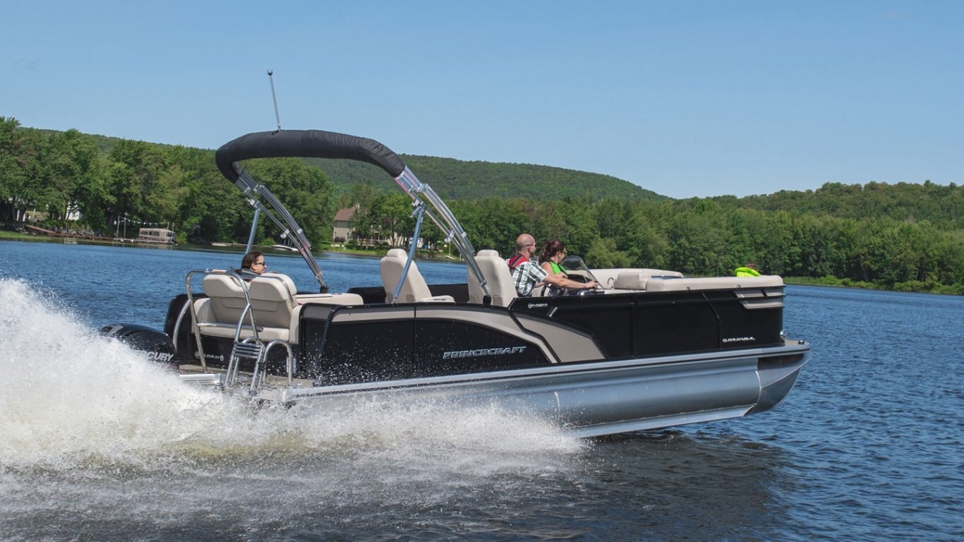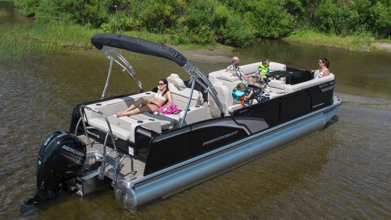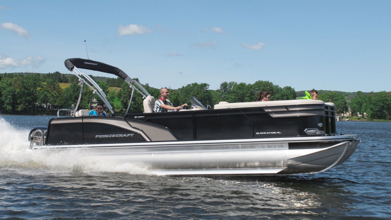 5052-H36 marine grade aluminum alloy NMMA & Transport Canada certified 2 ½" heavy-duty extruded Z-aluminum cross channels 1 1/4" anodized aluminum rails Sealed pontoon bulkheads with top mounted air plug (25") V-shaped aluminum engine pod Pressure-treated wood deck covered with marine grade carpet Extruded aluminum full-length pontoon keels Extruded aluminum full-length pontoon skirting Stern molded corners Rear padded sundeck Walk-thru rear gate with lift and lock hinges Walk-thru bow gate with lift and lock hinges Port side gate with lift and lock hinges (24'') Rear swim platform Stainless steel bow eye 4- 6" chromed deck cleats