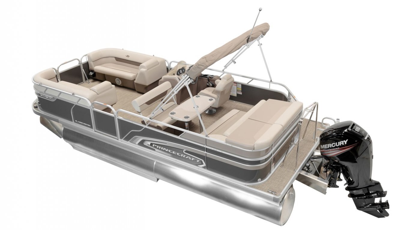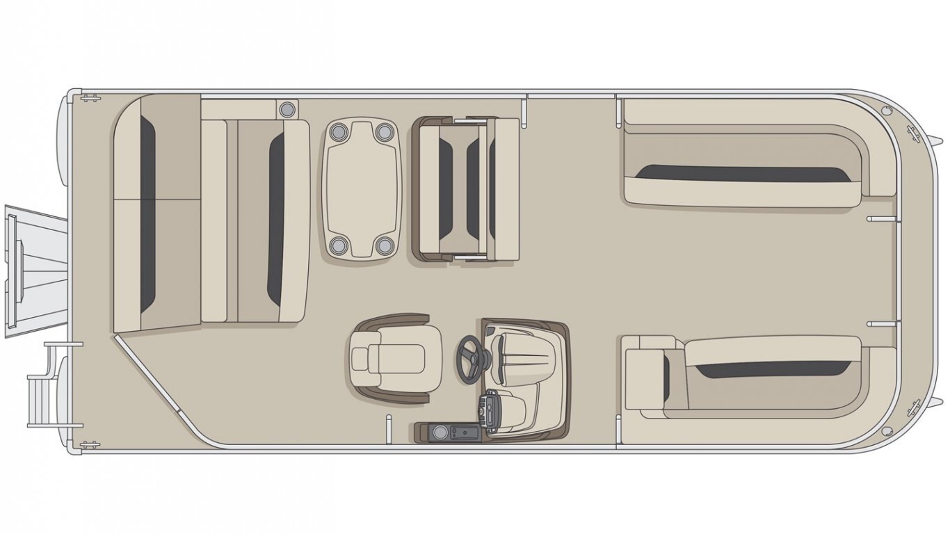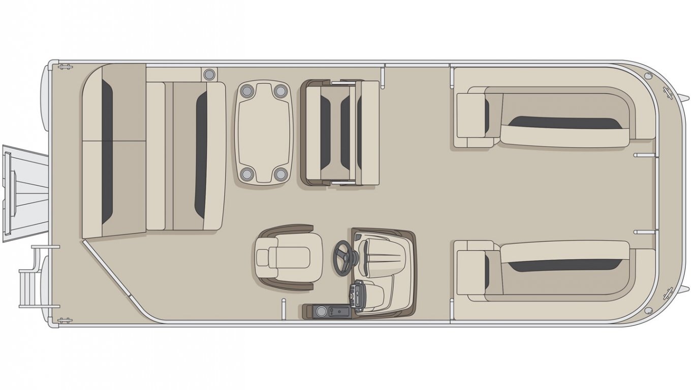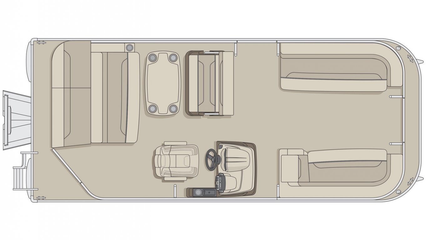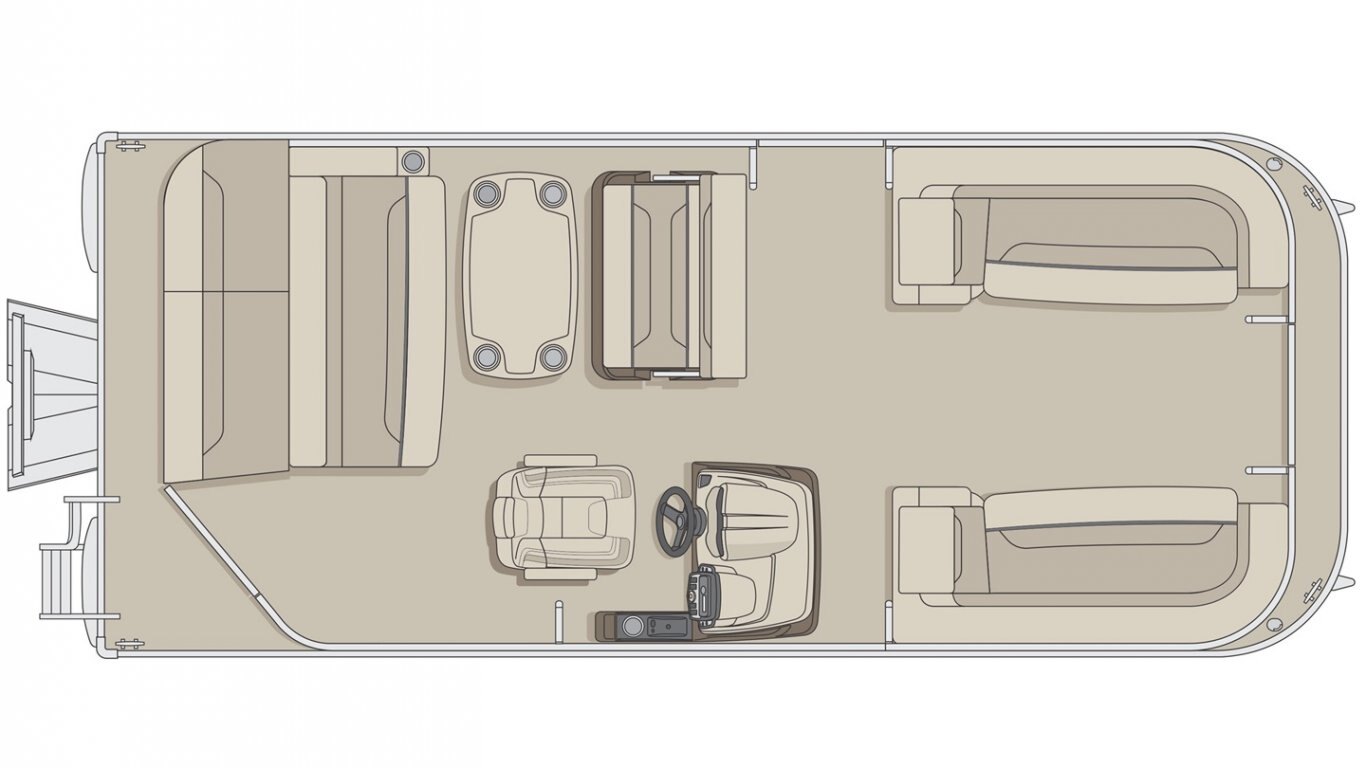 5052-H36 marine grade aluminum alloy NMMA & Transport Canada certified 2 ½" heavy-duty extruded Z-aluminum cross channels 1 1/4" anodized aluminum rails Sealed pontoon bulkheads with top mounted air plug (25") V-shaped aluminum engine pod Pressure-treated wood deck covered with marine grade carpet Extruded aluminum full-length pontoon keels Extruded aluminum full-length pontoon skirting Stern molded corners Rear padded sundeck Walk-thru rear gate with lift and lock hinges Walk-thru bow gate with lift and lock hinges Port side gate with lift and lock hinges (24'') Rear swim platform Stainless steel bow eye 4- 6" chromed deck cleats