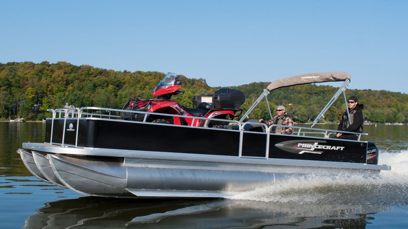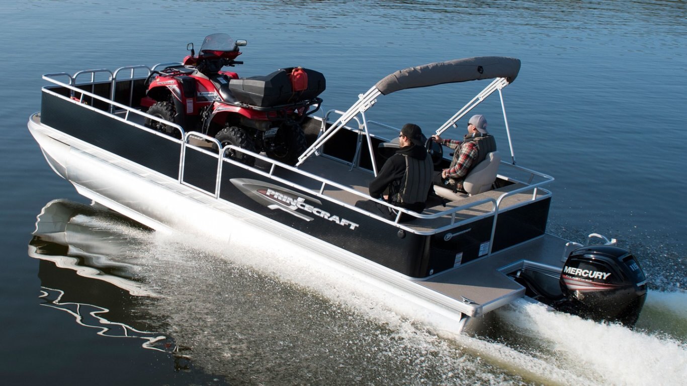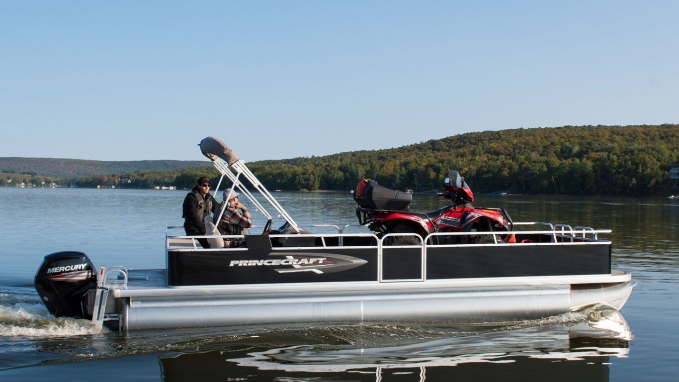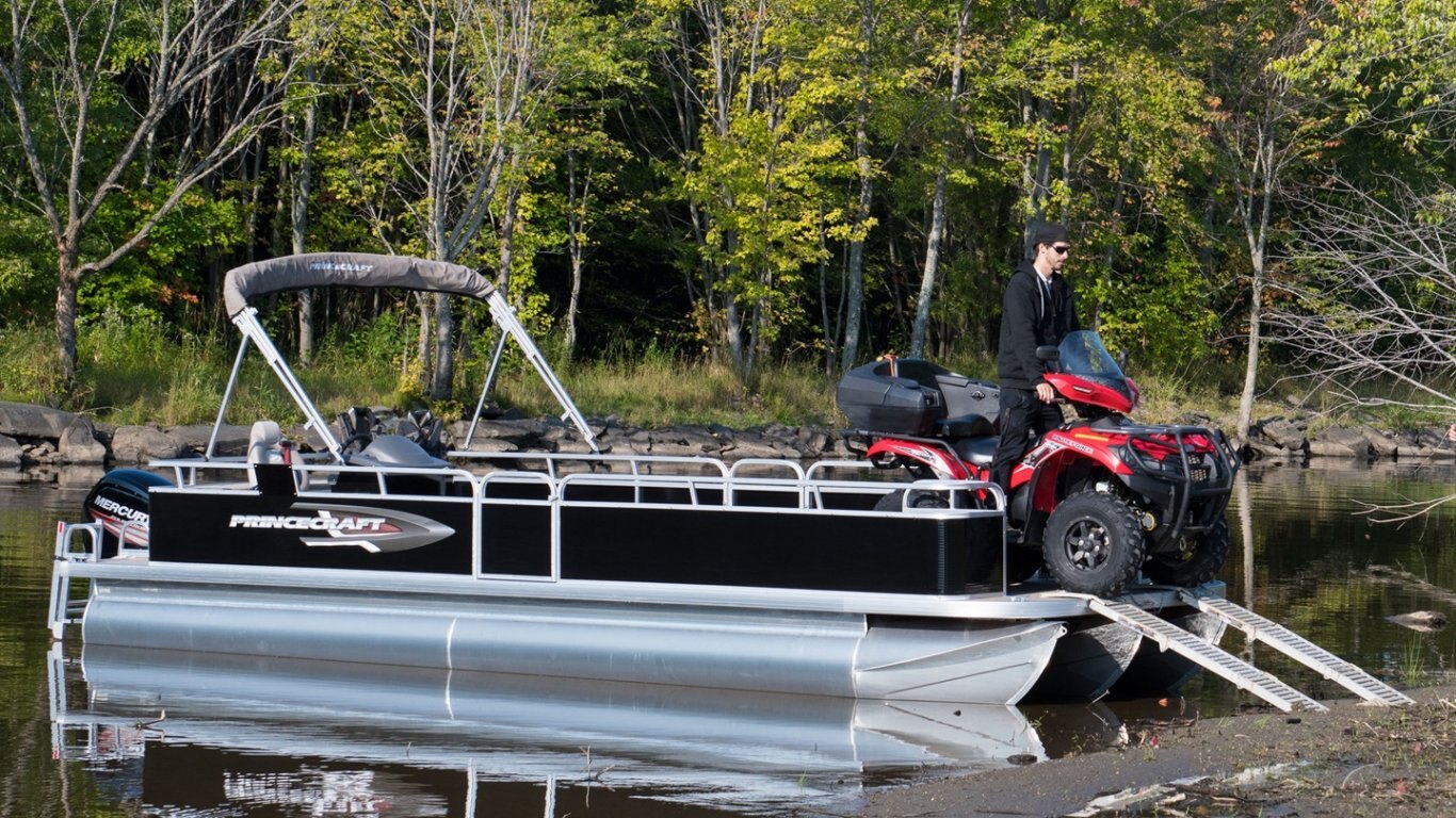 5052-H36 marine grade aluminum alloy NMMA & Transport Canada certified 2 ½" heavy-duty extruded Z-aluminum cross channels 1 1/4" anodized aluminum rails Sealed pontoon bulkheads with top mounted air plug (25") V-shaped aluminum engine pod Pressure-treated wood deck covered with marine grade vinyl Extruded aluminum full-length pontoon keels Extruded aluminum full-length pontoon skirting Stern molded corners Wide walk-thru double bow gate and lock hinges (52'') Starboard side gate with lift and lock hinges (24'') Port side gate with lift and lock hinges (24'') Stainless steel bow eye 4- 6" chromed deck cleats