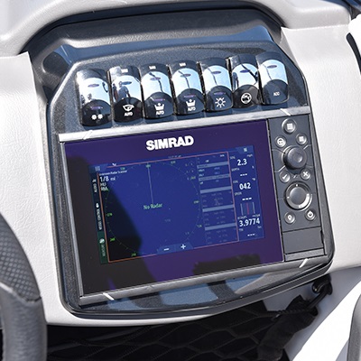 7'' SIMRAD evo3 multifunction touch screen, including GPS functionalities, fish finder, and down scan imaging