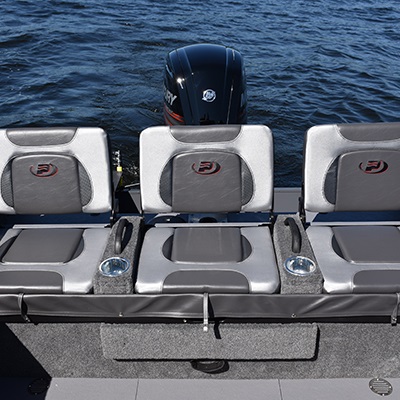Twin consoles with steering system Black anodized walk-thru curved tempered glass windshield with door Deluxe dash panel with switches and indicator lights No-FeedBack dual cable steering system Storage under driver console with extensible cargo net Storage under port side console with extensible cargo net