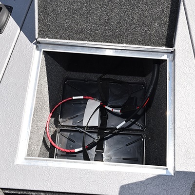 Rod straps 7 foot rod storage without support In-floor lockable rod organizer for 4 rods 12V or 24V bow trolling motor plug & receptacle with wiring harness Trolling motor plug with 60 AMP protection Bow mounting trolling motor pad