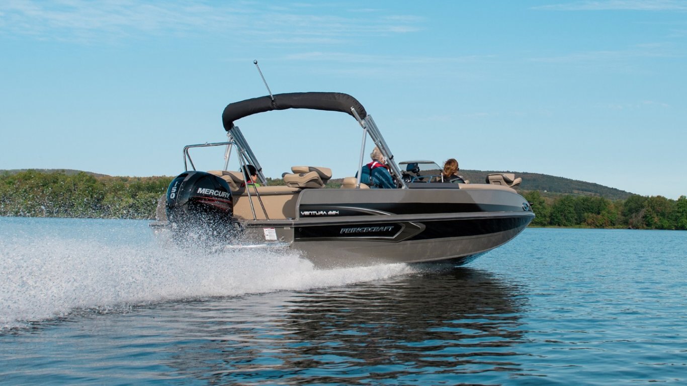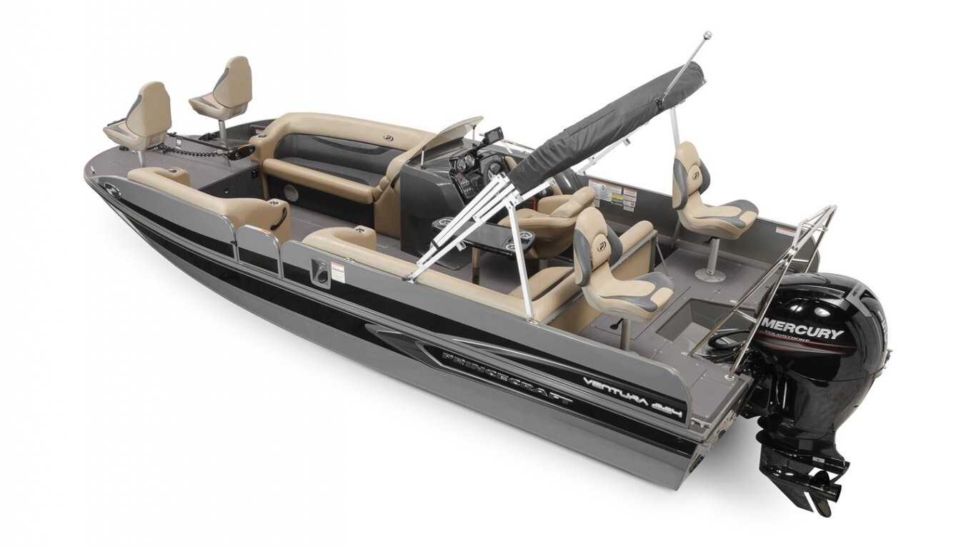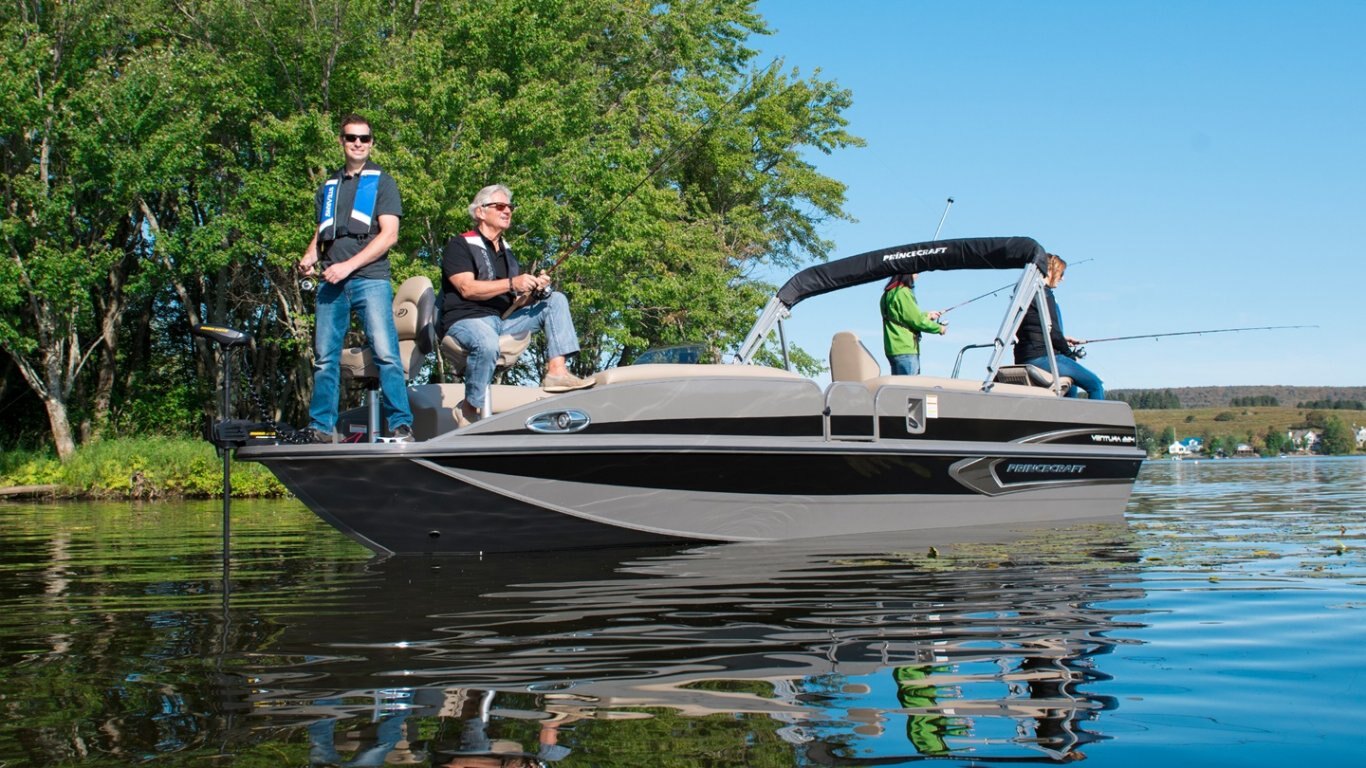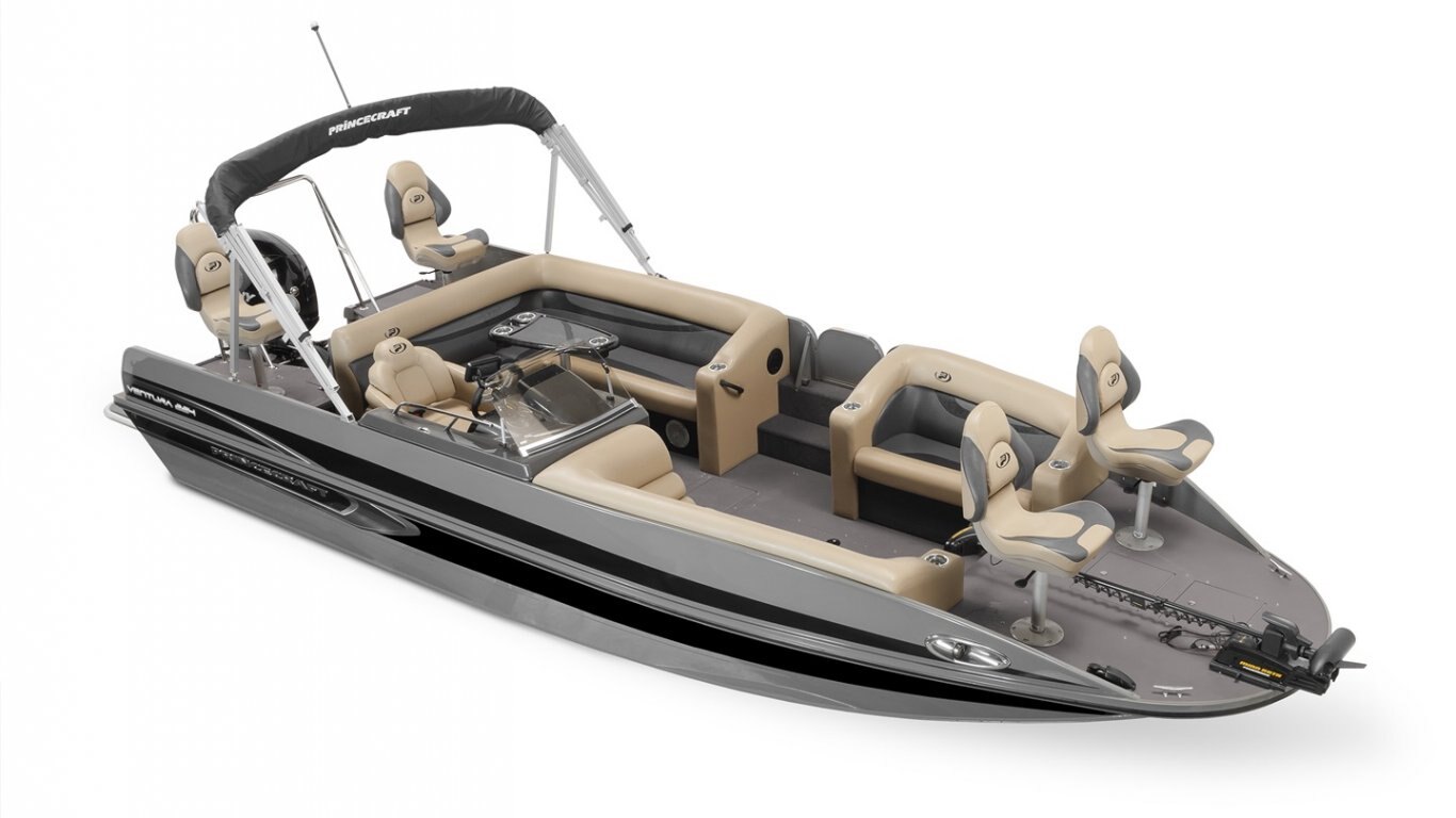 This 22’-2’’ aluminum deck boat can comfortably sit up to 12 and be powered by an engine ranging from 150 to 200 HP. With its 174 L (46 U.S. gal.) gas tank, its chaise lounge, its 4 folding seats, 2 large electric-filled aerated livewells, and a lockable rod storage compartment, it is the ideal deck boat to go fishing or just cruising!