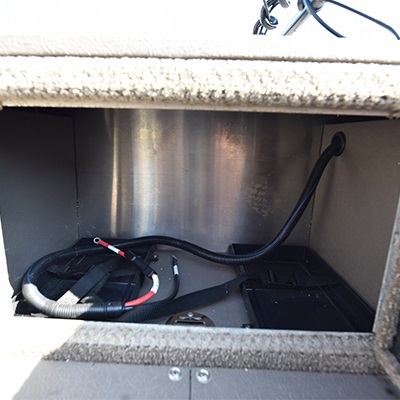 12V or 24V bow trolling motor plug & receptacle with 2 battery tie-downs 2 - 44" long built-in electric-filled aerated livewell (77 L / 20 U.S. gal.) 7-foot lockable rod storage compartment