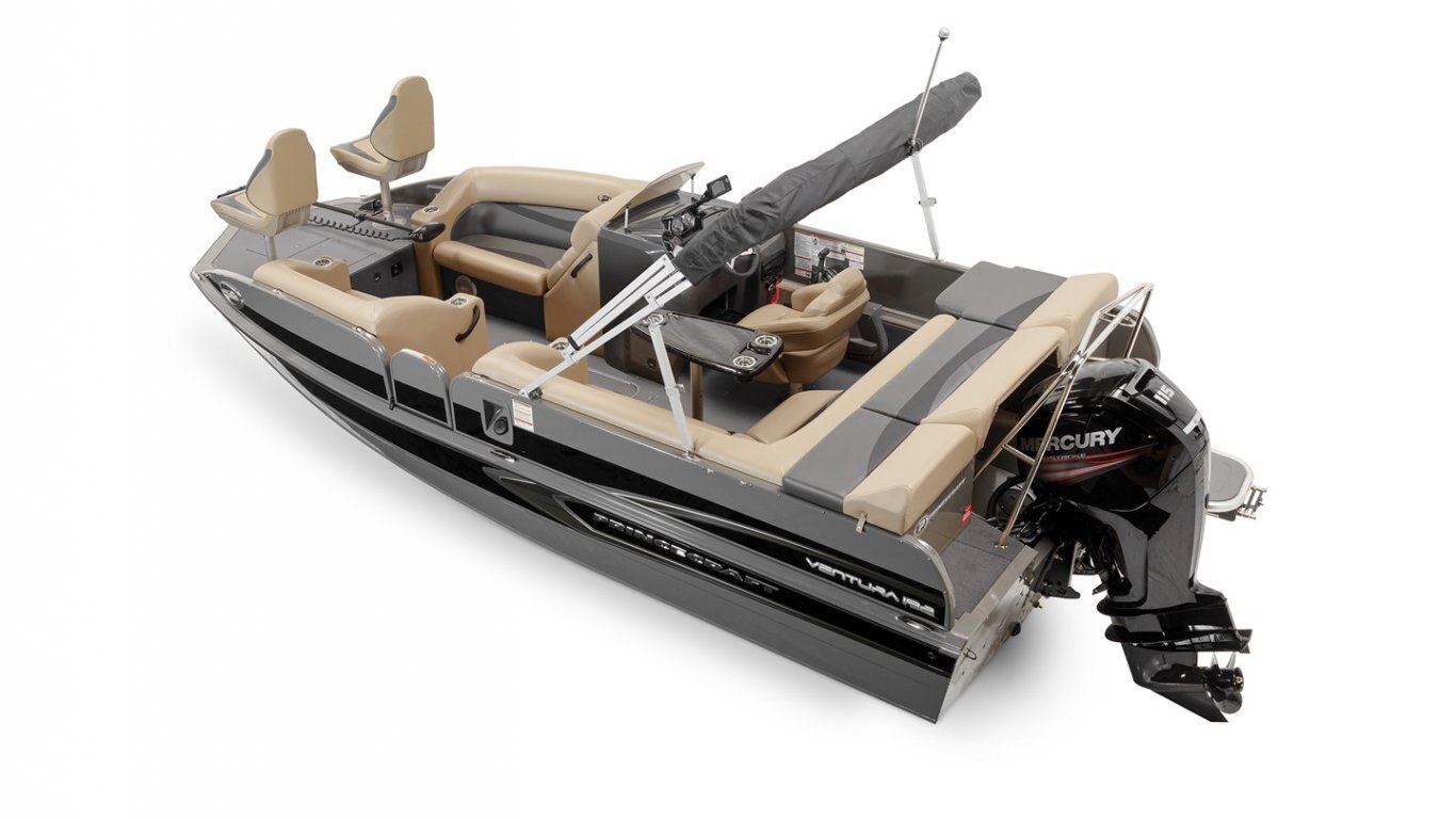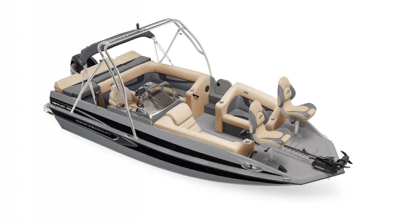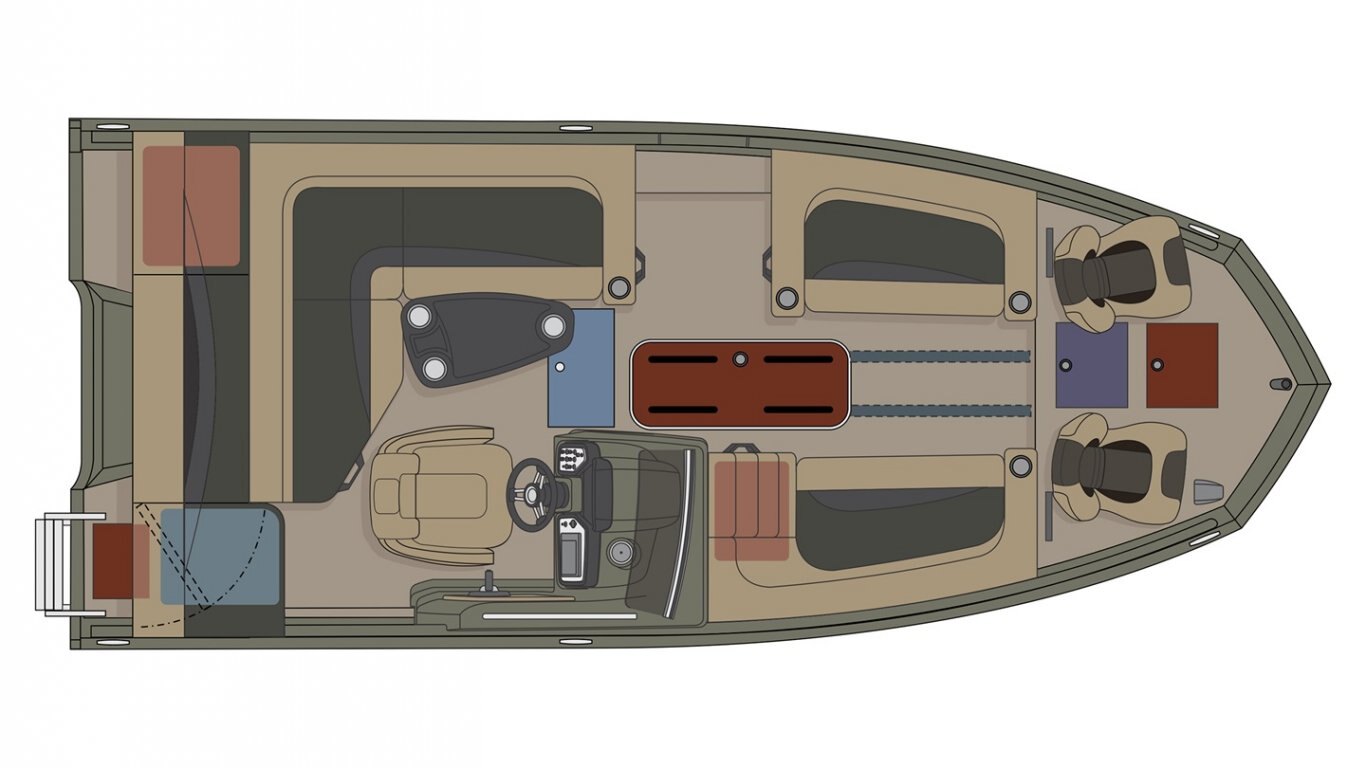 This 19’-2’’ aluminum deck boat can comfortably sit up to 8 (10 in the USA) and be powered by an engine ranging from 115 to 150 HP. With its 174 L (46 U.S. gal.) gas tank, its full-width rear padded sundeck, its chaise lounge, its 2 folding seats, a large electric-filled aerated livewell, and a lockable rod storage compartment, it is the ideal deck boat to go fishing or just cruising!