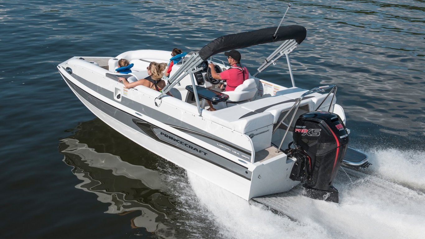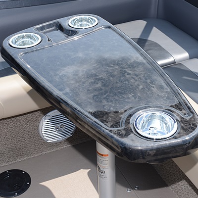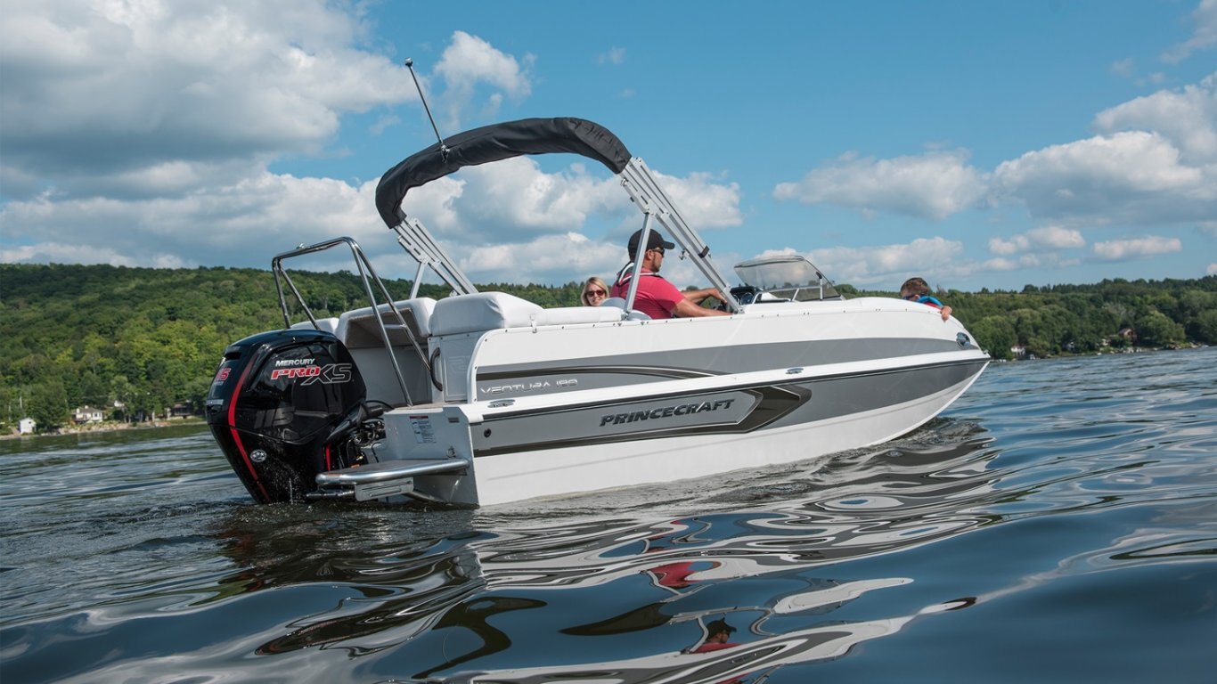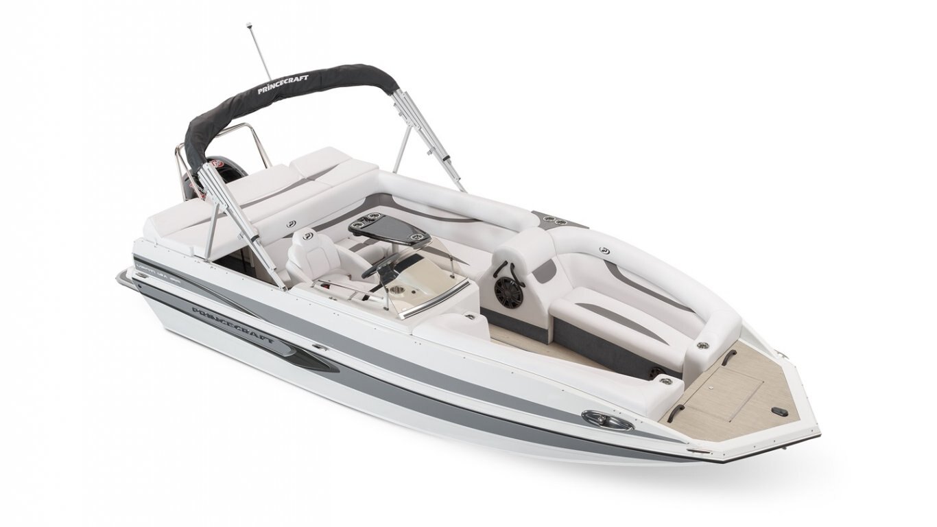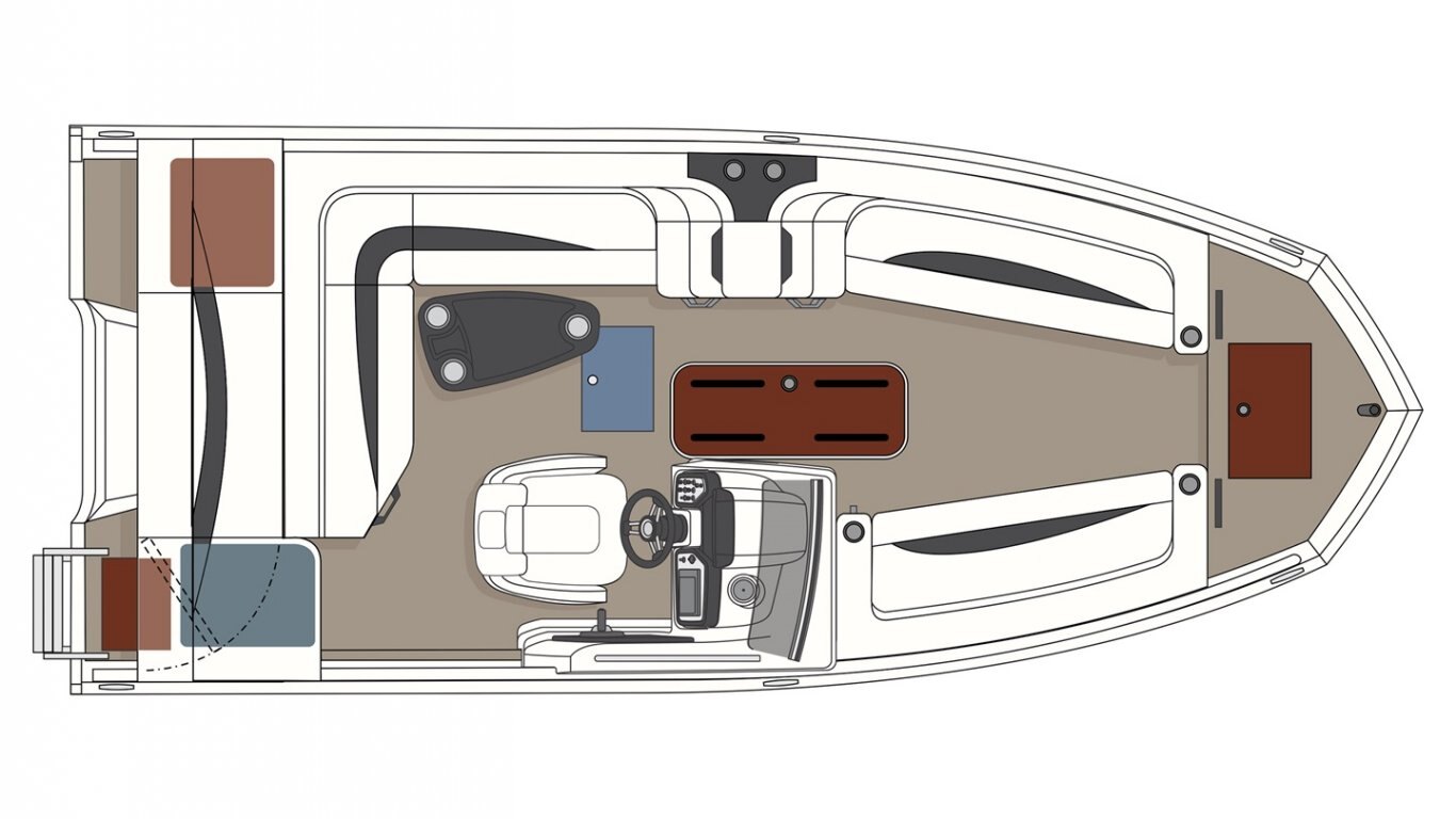 This 19’-2’’ aluminum deck boat can comfortably sit up to 8 (10 in the USA) and be powered by an engine ranging from 115 to 150 HP. With its 174 L (46 U.S. gal.) gas tank, its full-width rear padded sundeck, built-in floor cooler, its radio, and its 2 chaise lounges, it is the ideal deck boat to go cruising!
