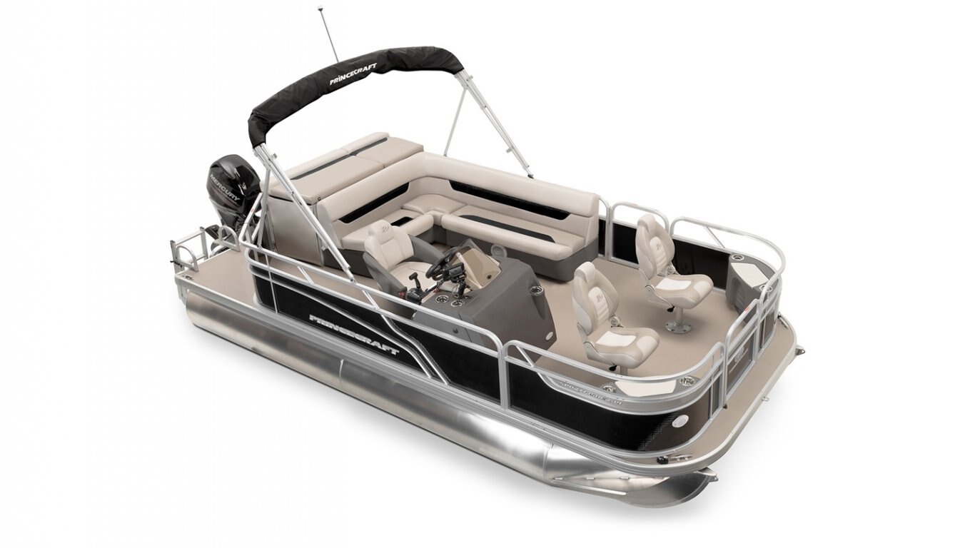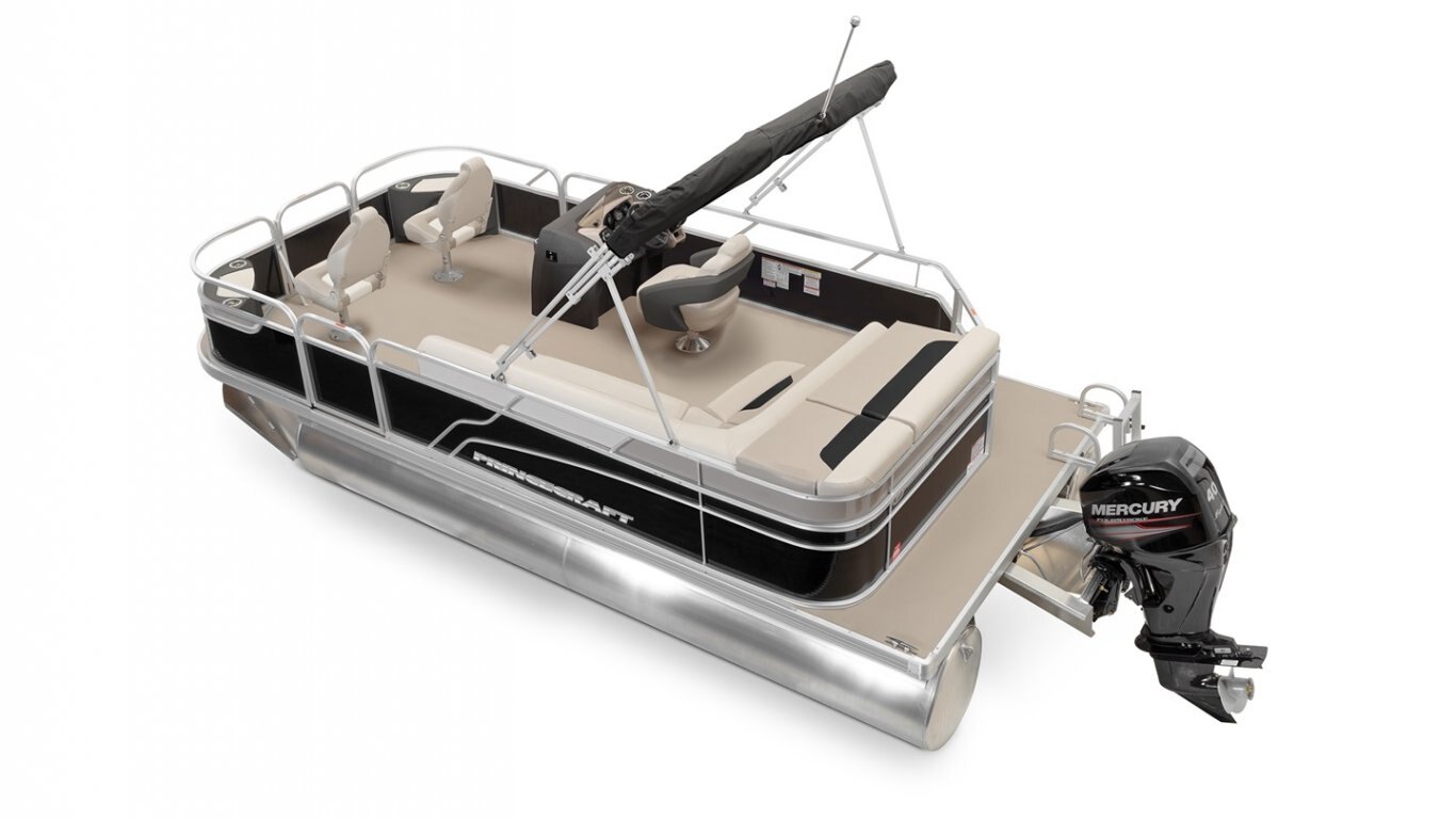 5052-H36 marine grade aluminum alloy NMMA & Transport Canada certified 2 ½" heavy-duty extruded Z-aluminum cross channels 1 1/4" anodized aluminum rails Sealed pontoon bulkheads with top mounted air plug (25") V-shaped aluminum engine pod Pressure-treated wood deck covered with marine grade carpet Extruded aluminum full-length pontoon keels Extruded aluminum full-length pontoon skirting Stern molded corners Rear padded sundeck Walk-thru rear gate with lift and lock hinges Walk-thru bow gate with lift and lock hinges Port side gate with lift and lock hinges (24'') Rear swim platform Stainless steel bow eye 2- 6" stainless steel deck cleats 2 stainless steel recessed cleats