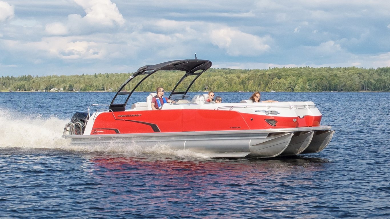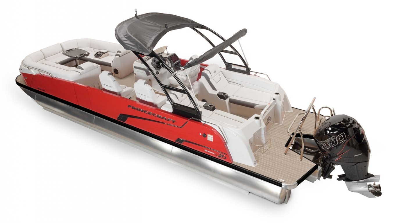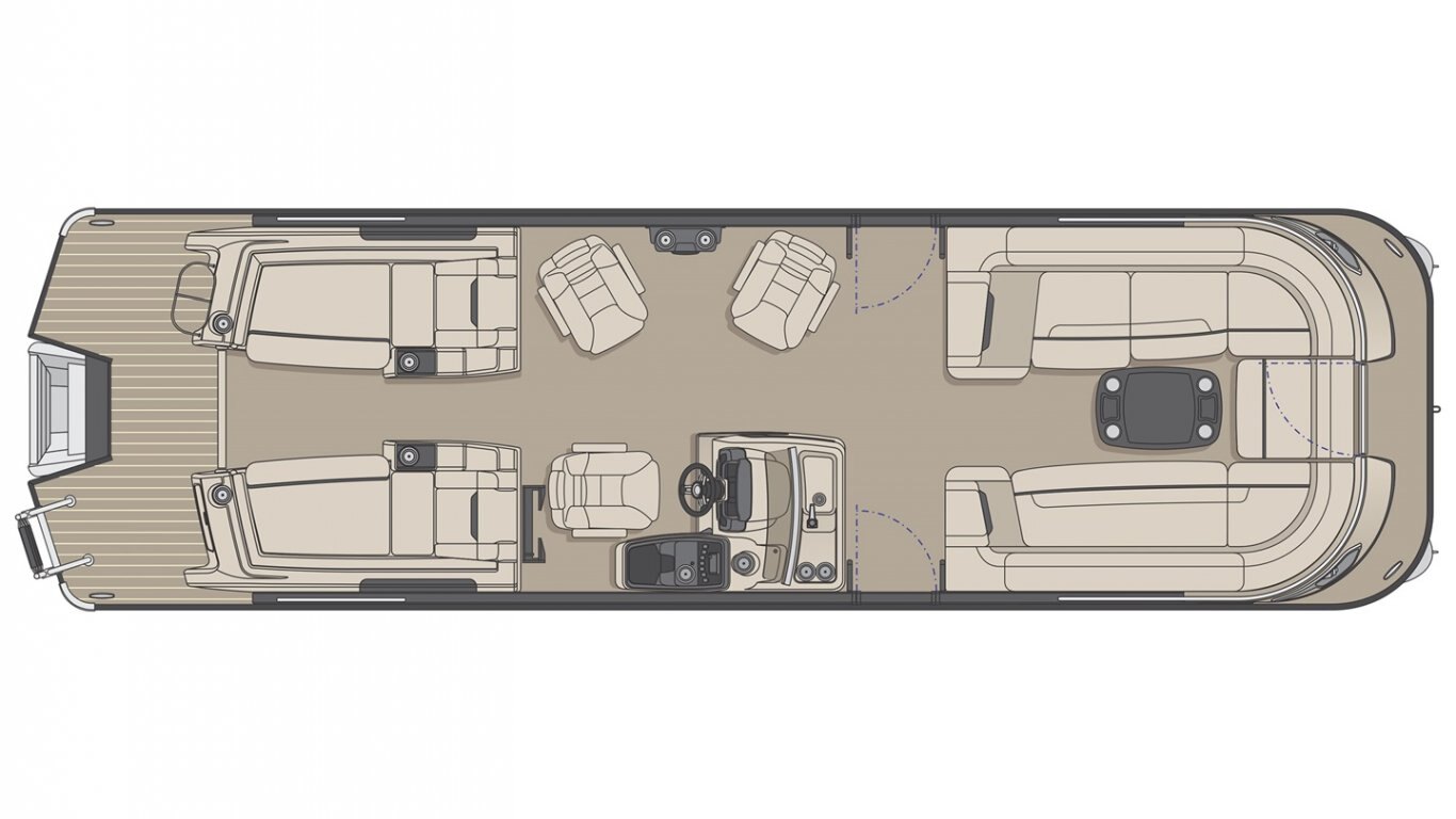This 29’-10’’ pontoon features all the comfort and convenience you enjoy at home… and more. A galley unit with a sink and faucet, water tank (portable), rear swim platform, ultra-plush upholstery, chaise lounges, radio, and so much more. Have a party with up to 16 friends or enjoy your favorite water sports. Rig your pontoon with an engine from 200 up to 400 HP with the standard Performance Configuration and get ready for some serious fun!