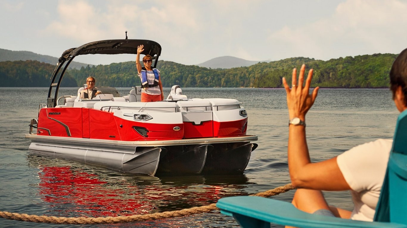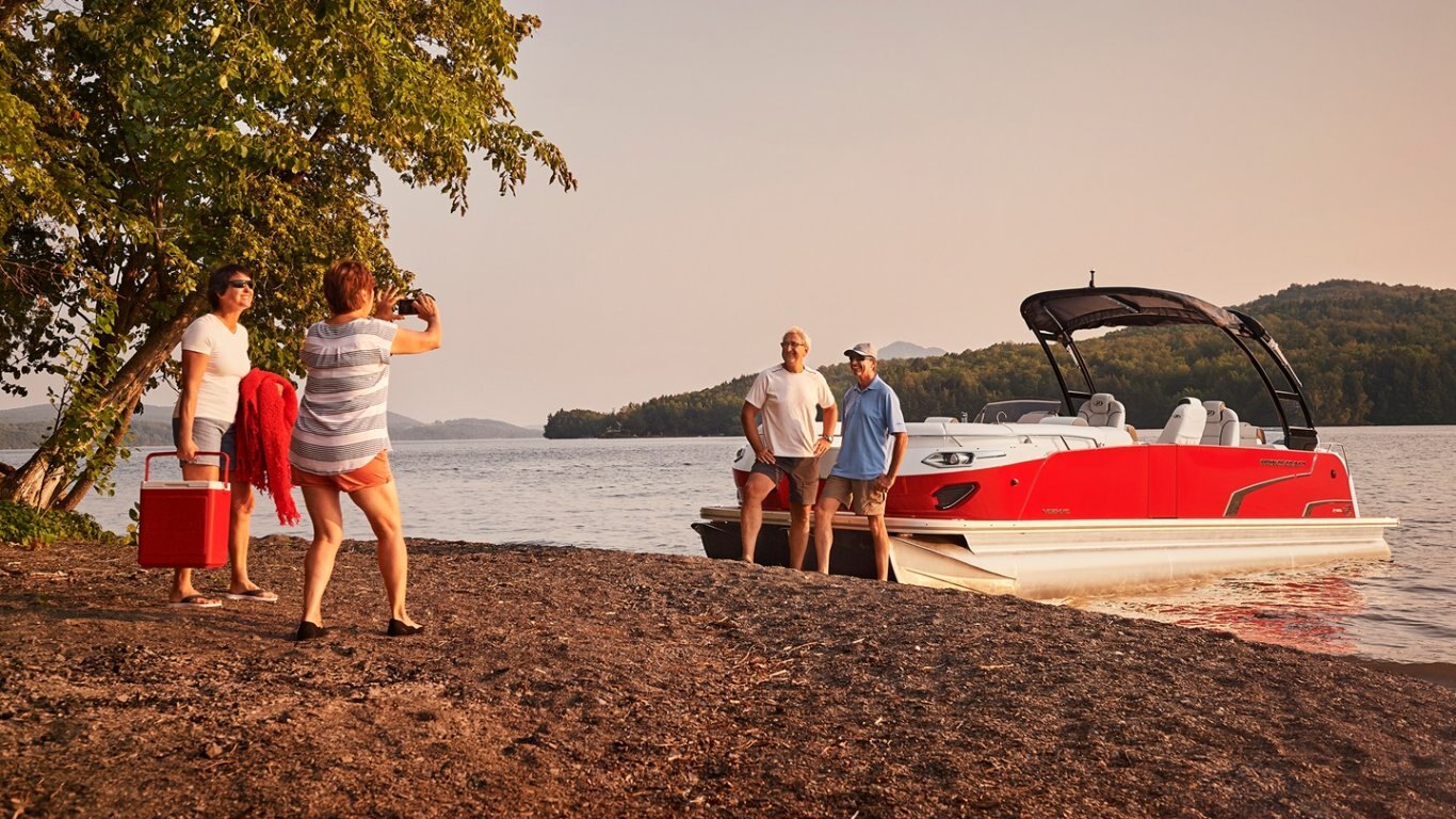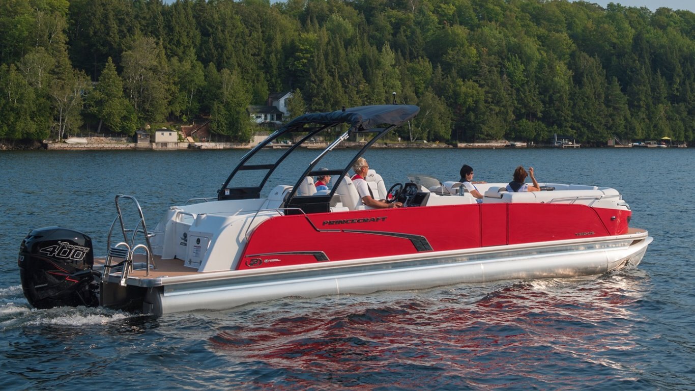 This 29’-10’’ pontoon features all the comfort and convenience you enjoy at home… and more. A galley unit with a sink and faucet, water tank (portable), rear swim platform, ultra-plush upholstery, chaise lounges, radio, and so much more. Have a party with up to 16 friends or enjoy your favorite water sports. Rig your pontoon with an engine from 200 up to 400 HP with the standard Performance Configuration and get ready for some serious fun!