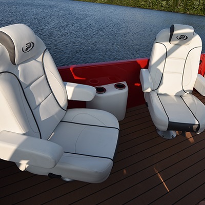 Ultra plush and heavy weight upholstery Roto-Cast furniture bases and backs Removable bow gate seat Speaker unit including USB port and 2 cup holders Reclining captain's chair on slide and swivel Passenger seats on slide and swivel 4 chaise lounges Storage in chaise lounges' reclined section 3 storage pouches Storage under all lounges Pop-up privacy enclosure Bow black pearl woodgrain pedestal mount snack table with drink holders