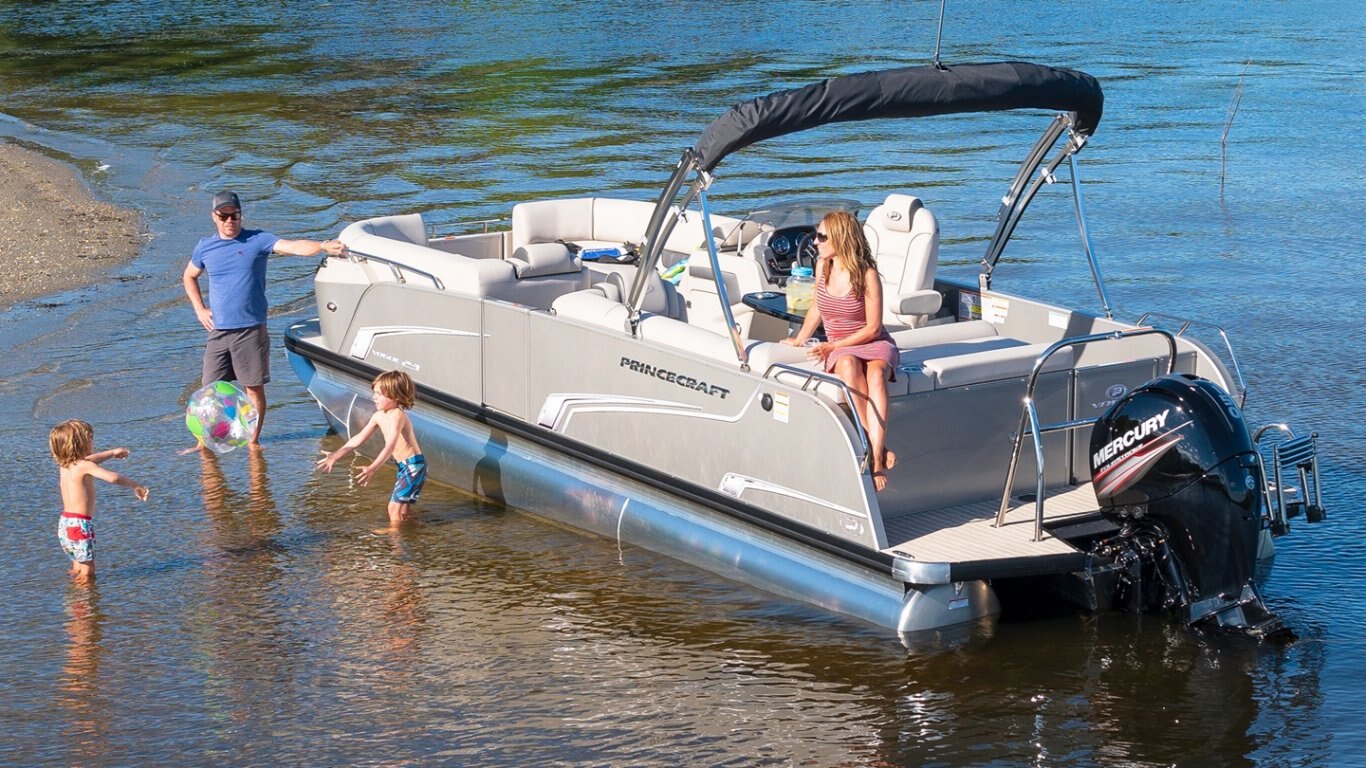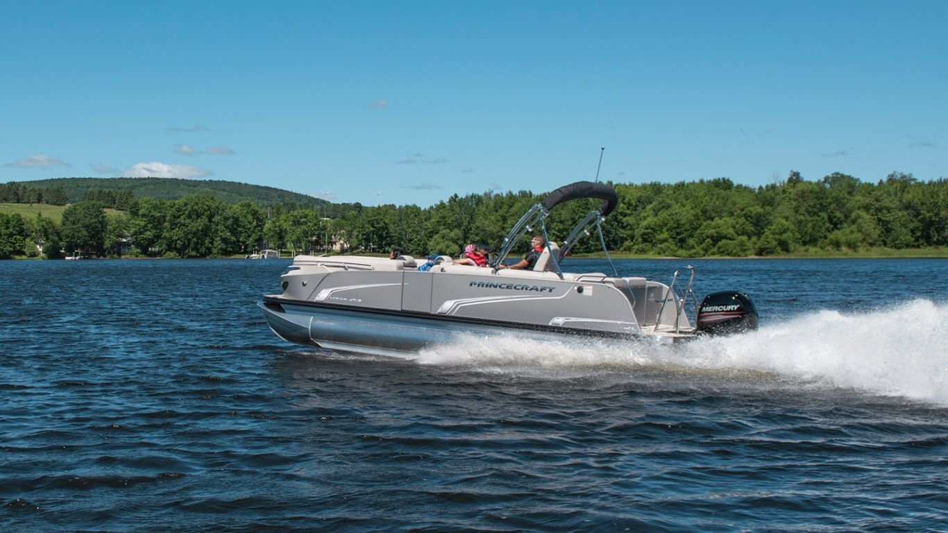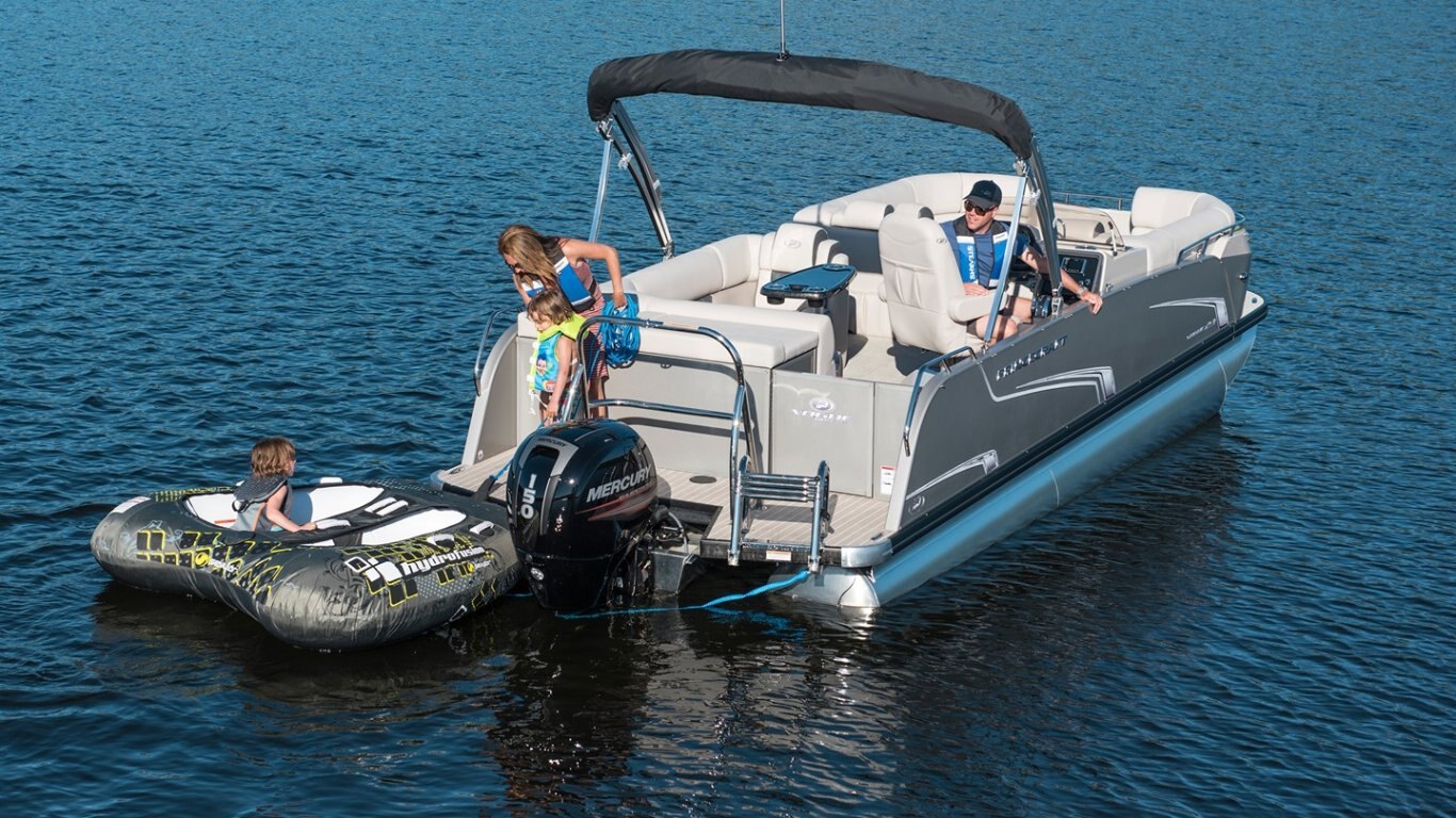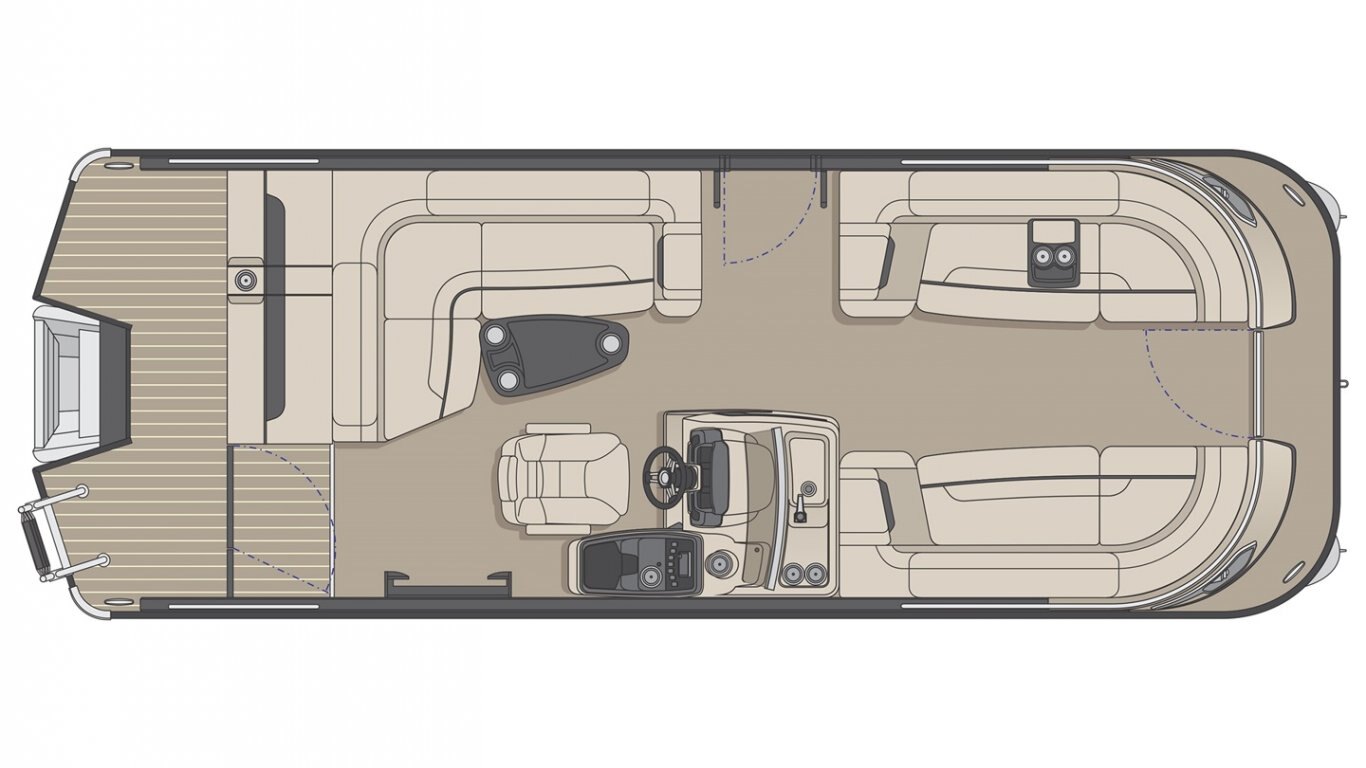 This 23’-11’’ pontoon features all the comfort and convenience you enjoy at home… and more. A galley unit with a sink and faucet, water tank (portable), rear reclining padded sundeck, rear swim platform, ultra-plush upholstery, chaise lounges, radio, and so much more. Have a party with up to 10 friends or enjoy your favorite water sports. Rig your pontoon with an engine up to 250 HP (with the optional Performance Configuration) and get ready for some serious fun!