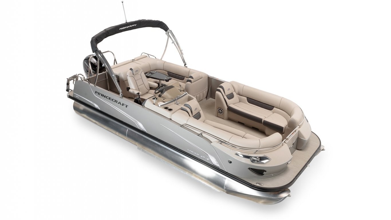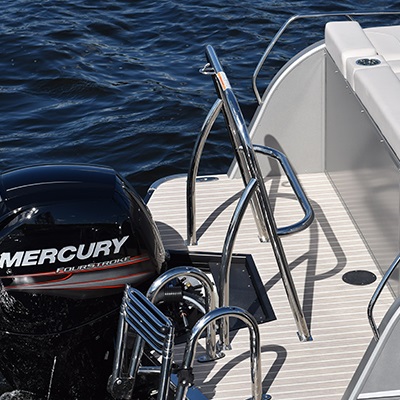 5052-H36 marine grade aluminum alloy NMMA & Transport Canada certified 2 ½" heavy-duty extruded Z-aluminum cross channels APS style side panels Sealed pontoon bulkheads with top mounted air plug (25") V-shaped aluminum engine pod Pressure-treated wood deck covered with marine grade carpet Extruded aluminum full-length pontoon keels Extruded aluminum full-length pontoon skirting Stern molded corners Rear reclining padded sundeck Walk-thru rear gate with lift and lock hinges Walk-thru bow gate with lift and lock hinges Port side gate with lift and lock hinges (20'') Rear swim platform Bow fiberglass molded section with integrated LED lighting Stainless steel bow eye 4 stainless steel recessed cleats Rear gate holder