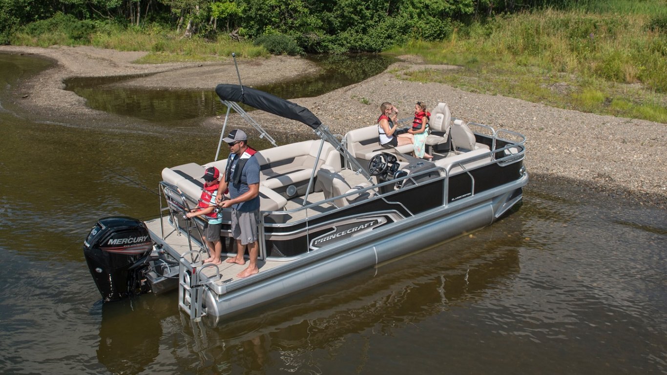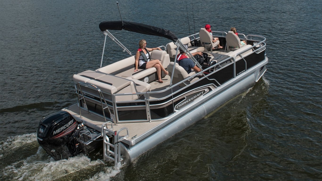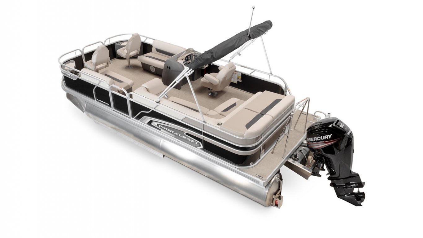 5052-H36 marine grade aluminum alloy NMMA & Transport Canada certified 2 ½" heavy-duty extruded Z-aluminum cross channels 1 1/4" anodized aluminum rails Sealed pontoon bulkheads with top mounted air plug (25") V-shaped aluminum engine pod Pressure-treated wood deck covered with marine grade carpet Extruded aluminum full-length pontoon keels Extruded aluminum full-length pontoon skirting Stern molded corners Rear padded sundeck Walk-thru rear gate with lift and lock hinges Walk-thru bow gate with lift and lock hinges Port side gate with lift and lock hinges (22'') Rear swim platform Stainless steel bow eye 2- 6" stainless steel deck cleats 2 stainless steel recessed cleats
