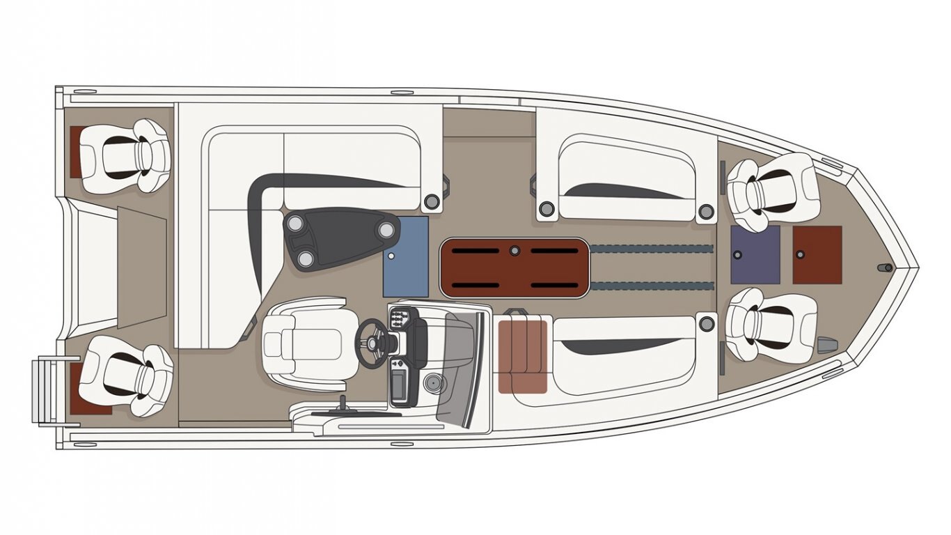 This 19’-2’’ aluminum deck boat can comfortably sit up to 8 (10 in the USA) and be powered by an engine ranging from 115 to 150 HP. With its 174 L (46 U.S. gal.) gas tank, its chaise lounge, its 4 folding seats, a large electric-filled aerated livewell, and a lockable rod storage compartment, it is the ideal deck boat to go fishing or just cruising!