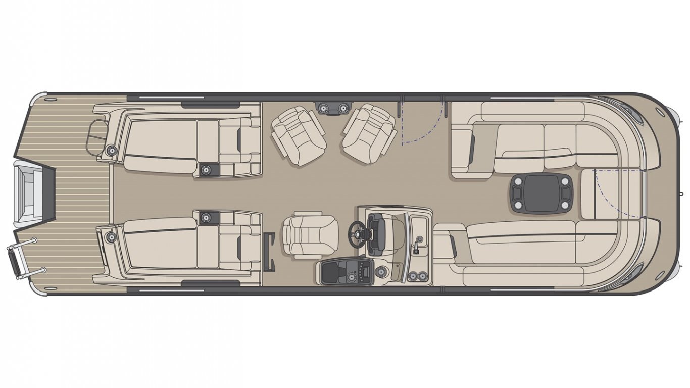 Ultra plush and heavy weight upholstery Roto-Cast furniture bases and backs Removable bow gate seat Speaker unit including USB port and 2 cup holders Reclining captain's chair on slide and swivel Passenger captain seats on slide and swivel 4 chaise lounges Storage in chaise lounges' reclined section 1 storage pouch Storage under all lounges Pop-up privacy enclosure Bow black pearl woodgrain pedestal mount snack table with drink holders