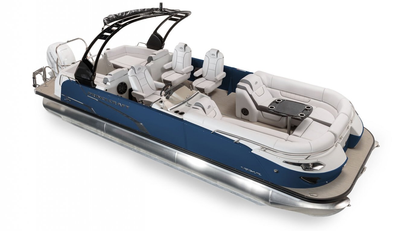 This 27’-11’’ pontoon features all the comfort and convenience you enjoy at home… and more. A galley unit with a sink and faucet, water tank (portable), rear swim platform, ultra-plush upholstery, chaise lounges, radio, and so much more. Have a party with up to 13 friends or enjoy your favorite water sports. Rig your pontoon with an engine from 150 up to 450 HP with the standard Performance Configuration and get ready for some serious fun!