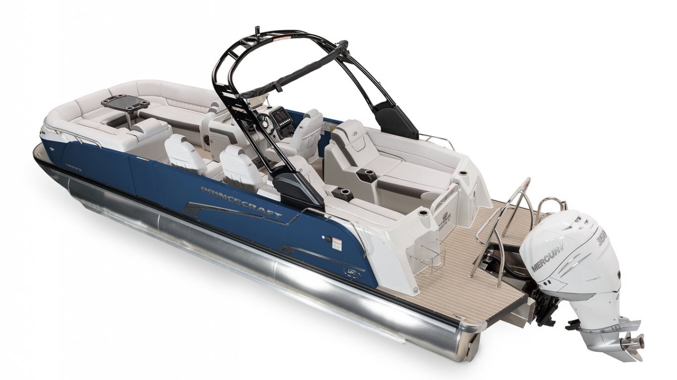 5052-H36 marine grade aluminum alloy NMMA & Transport Canada certified 2 ½" heavy-duty extruded Z-aluminum cross channels APS style side panels Sealed pontoon bulkheads with top mounted air plug (25") V-shaped aluminum engine pod Pressure-treated wood deck covered with marine grade carpet Extruded aluminum full-length pontoon keels Extruded aluminum full-length pontoon skirting Stern molded corners Walk-thru rear gate with lift and lock hinges Walk-thru bow gate with lift and lock hinges Port side gate with lift and lock hinges (20'') Rear swim platform Bow fiberglass molded section with integrated LED lighting Stainless steel bow eye 4 stainless steel recessed cleats Performance Configuration: 3rd log, full-length aluminum under-deck spray shield, lifting strakes, 49 U.S. gal. / 185 L gas tank, and 1 in-floor storage compartment
