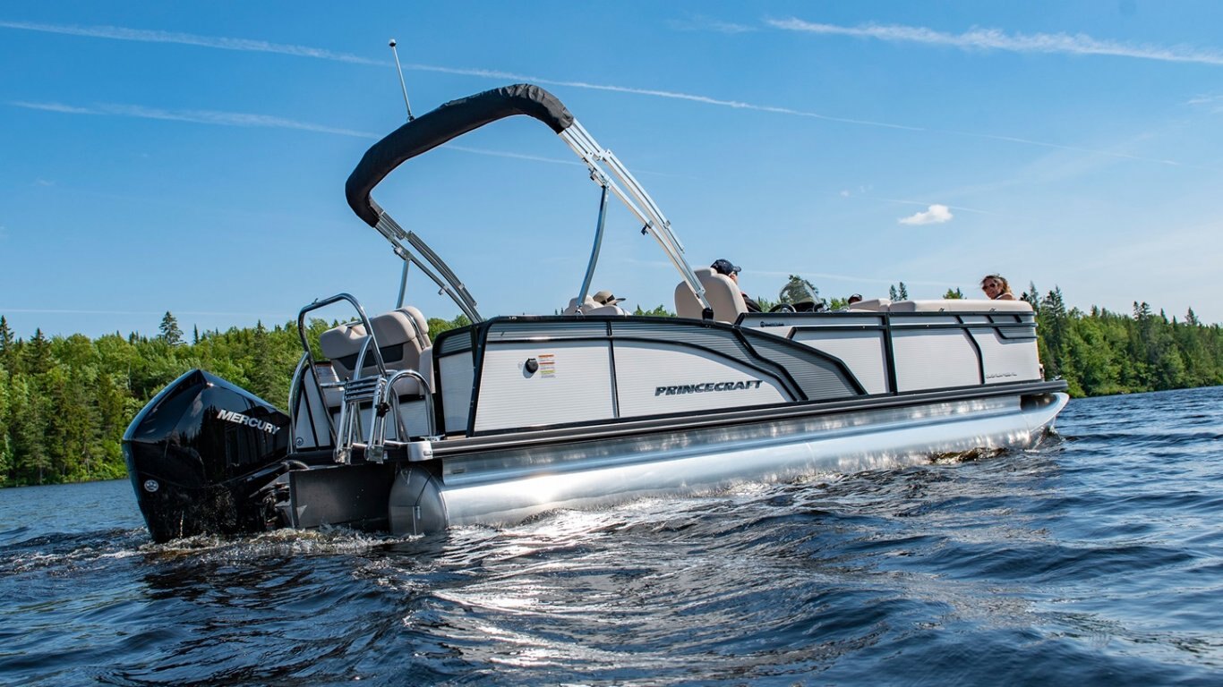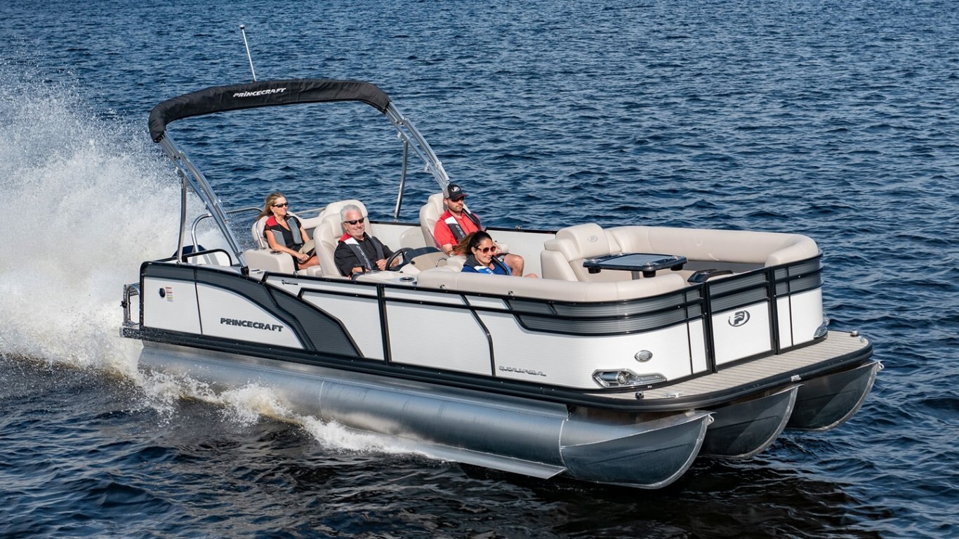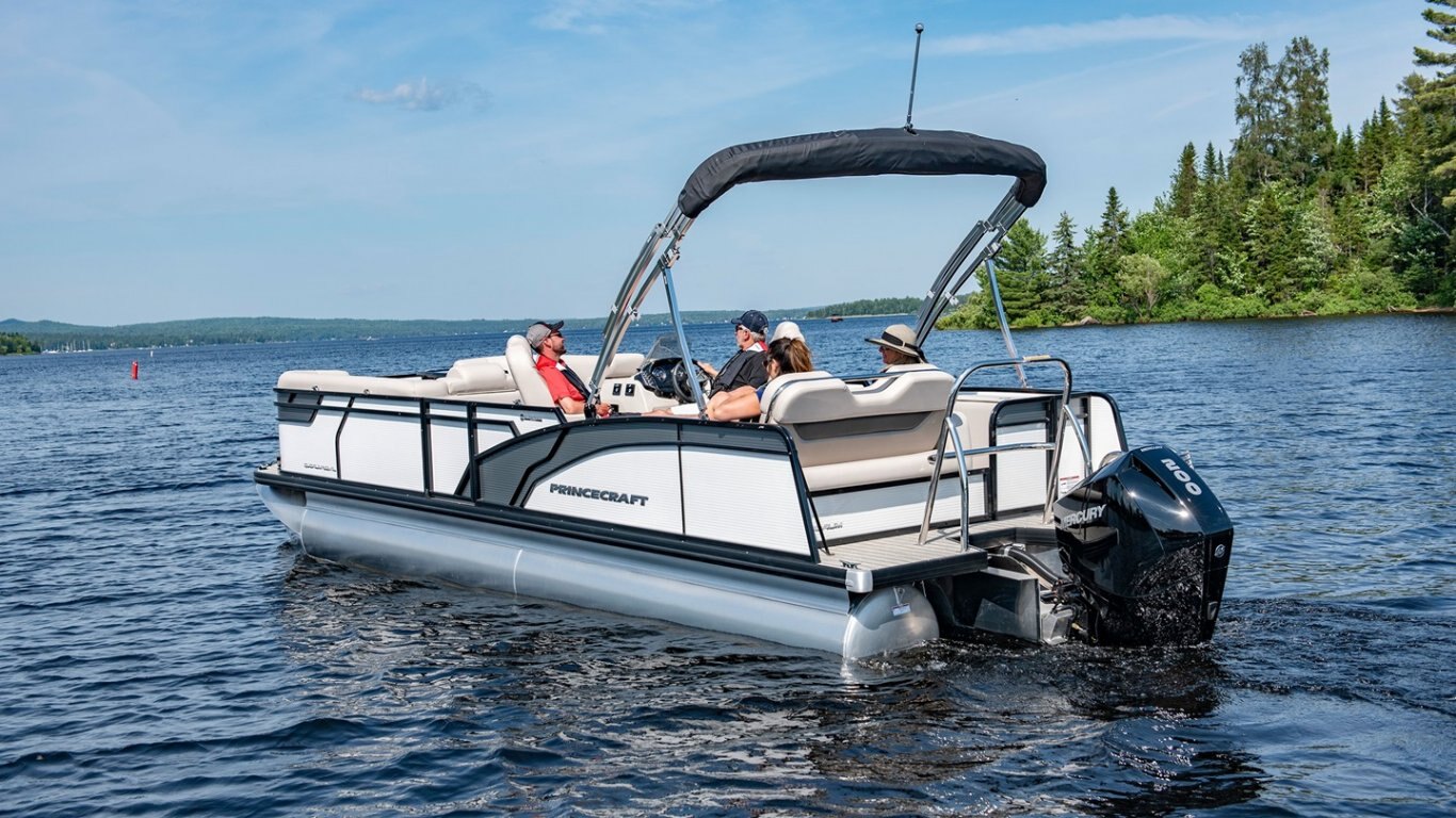 5052-H36 marine grade aluminum alloy NMMA & Transport Canada certified 2 ½" heavy-duty extruded Z-aluminum cross channels 1 1/4" anodized aluminum rails Sealed pontoon bulkheads with top mounted air plug (25") V-shaped aluminum engine pod Pressure-treated wood deck covered with marine grade carpet Extruded aluminum full-length pontoon keels Extruded aluminum full-length pontoon skirting Stern molded corners Walk-thru rear gate with lift and lock hinges Walk-thru bow gate with lift and lock hinges Port side gate with lift and lock hinges (24'') Rear swim platform Stainless steel bow eye 4- 6" chromed deck cleats