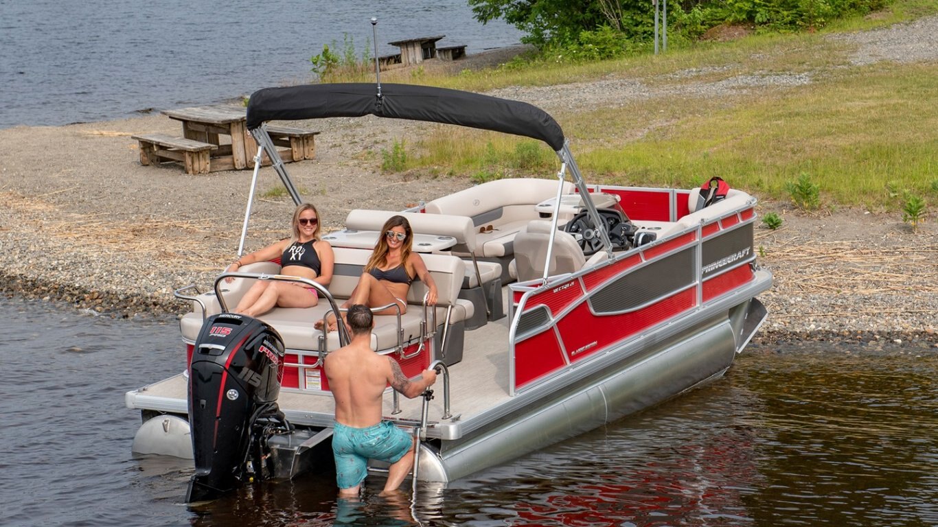 5052-H36 marine grade aluminum alloy NMMA & Transport Canada certified 2 ½" heavy-duty extruded Z-aluminum cross channels 1 1/4" anodized aluminum rails Sealed pontoon bulkheads with top mounted air plug (25") V-shaped aluminum engine pod Pressure-treated wood deck covered with marine grade carpet Extruded aluminum full-length pontoon keels Extruded aluminum full-length pontoon skirting Stern molded corners Walk-thru rear gate with lift and lock hinges Walk-thru bow gate with lift and lock hinges Port side gate with lift and lock hinges (24'') Rear swim platform Stainless steel bow eye 4- 6" chromed deck cleats 110 L / 29 U.S. gal. built-in gas tank