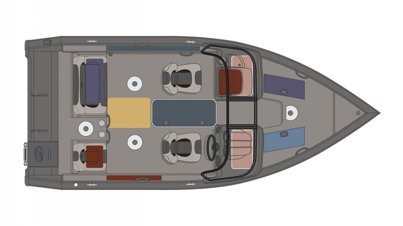 5052-H36 marine grade aluminum alloy NMMA & Transport Canada certified Exterior urethane paint choices, with a glossy finish including decal package Reverse chine hull design Deep self-draining splashwell Twin plating from bow to mid-ship Twin plating at the chine Rigging tube under flooring (from console to bow) Rigging tube under flooring (from stern to console) Stainless steel bow and stern eyes 4 chromed cleats BOW RAISED CASTING PLATFORM Ice chest Electric-filled aerated livewell Seat mount floor base AFT RAISED CASTING PLATFORM Battery storage compartment 2 fold-down jump seats Electric-filled aerated livewell Seat mount floor base