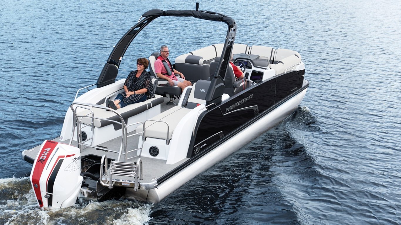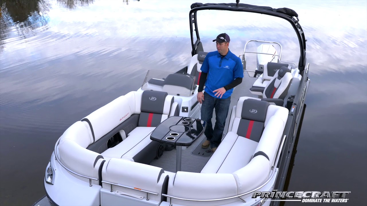 Platinum Meteorite Edition including Platinum Edition logo on both sides, diamond premium upholstery textured vinyl, LED lighting on floor, bimini top, pontoon logs, speakers and fixed cup holders