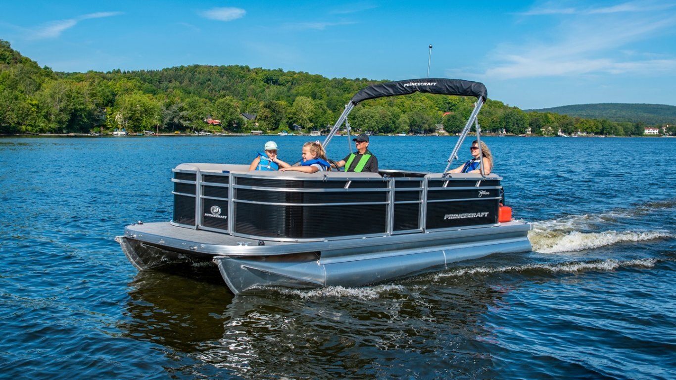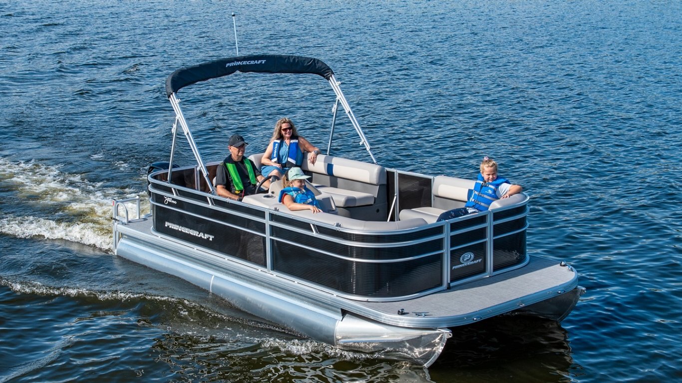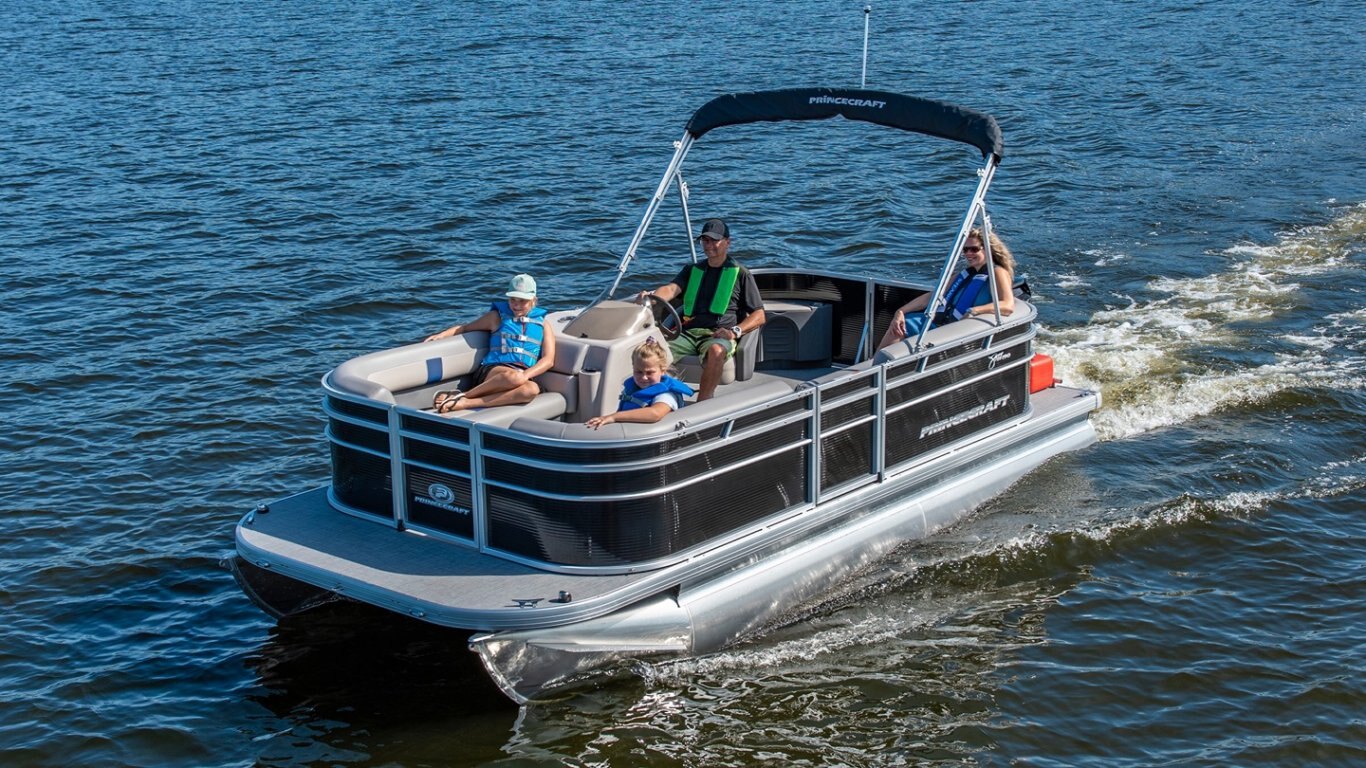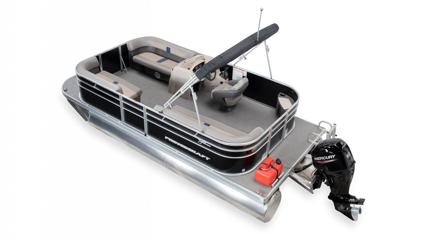 5052-H36 marine grade aluminum alloy NMMA & Transport Canada certified 2 ½" heavy-duty extruded Z-aluminum cross channels 1 1/4" anodized aluminum rails Sealed pontoon bulkheads with top mounted air plug (23") V-shaped aluminum engine pod Pressure-treated wood deck covered with marine grade carpet Extruded aluminum full-length pontoon keels Extruded aluminum full-length pontoon skirting Stern molded corners Walk-thru rear gate with lift and lock hinges Walk-thru bow gate with lift and lock hinges Port side gate with lift and lock hinges (24'') Stern swim platform Stainless steel bow eye 4- 6" chromed deck cleats