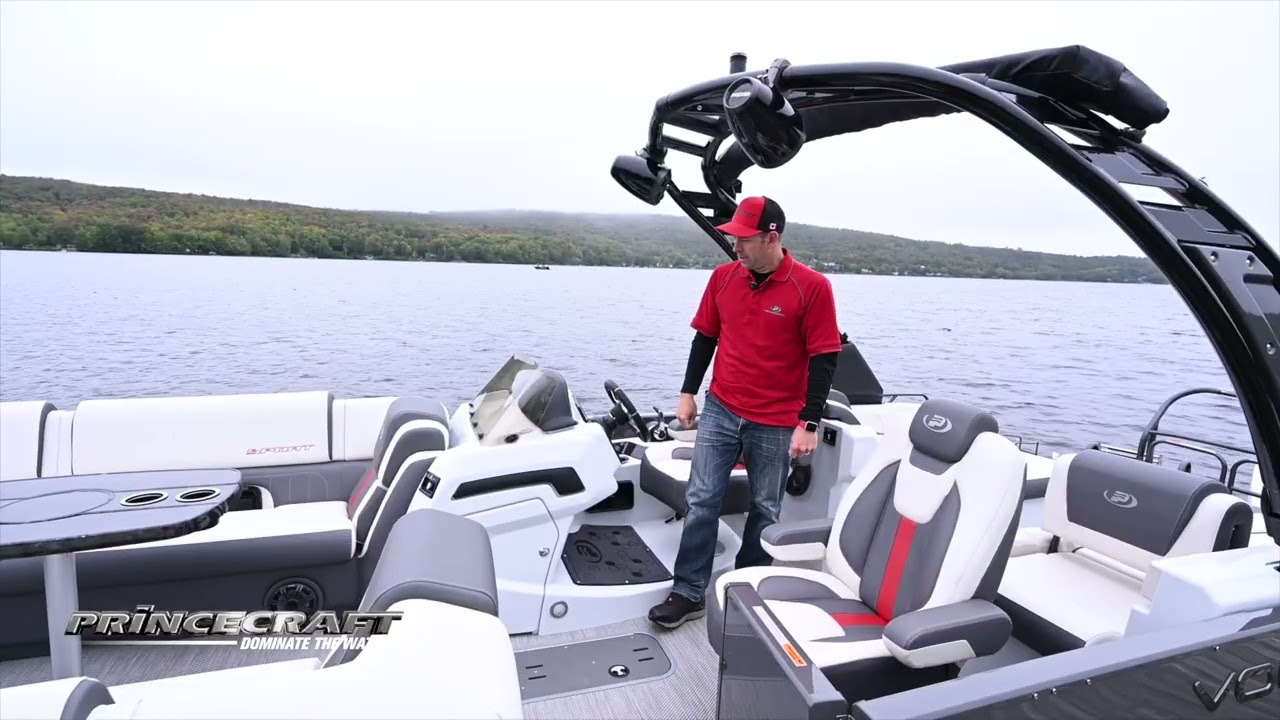 Automative style raised fiberglass helm Padded footrest with Princecraft logo SeaStar hydraulic steering system Molded dash panel with black inserts and lighted switches Sport tilt steering mechanism AM/FM/Bluetooth KMC100 Kicker Stereo with integrated USB plug and auxiliary input (1/8") in console 6 waterproof speakers Electric horn Wireless smartphone charger integrated to the console 12V outlet Push on/off console courtesy light LED lighting under driver console Quick release smoked windscreen