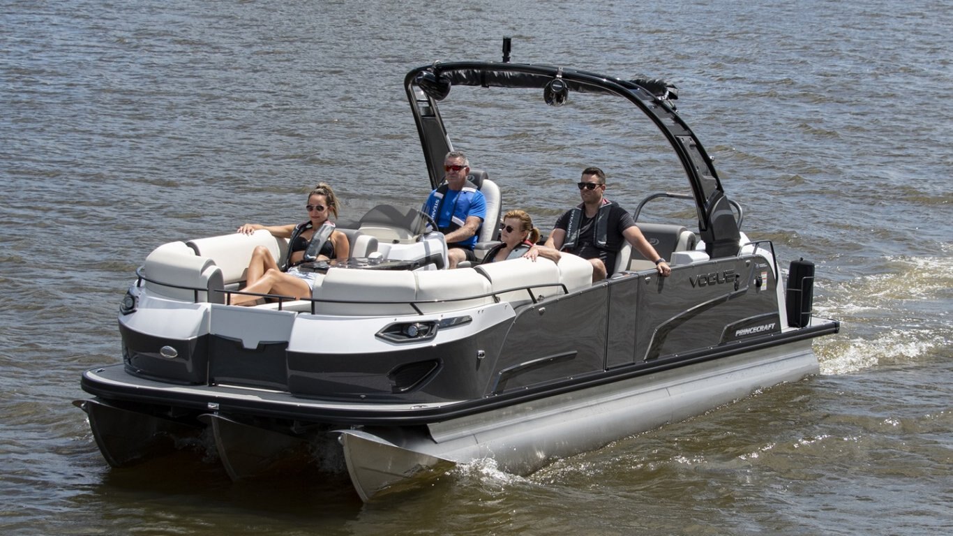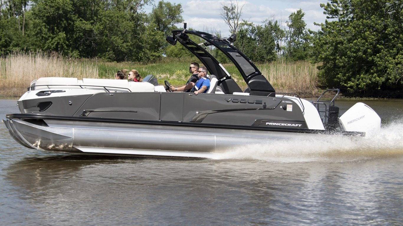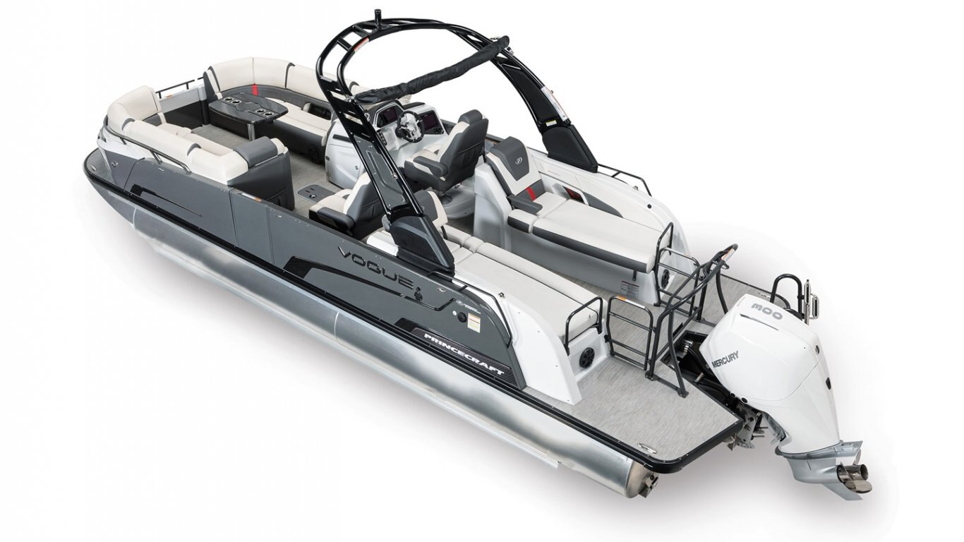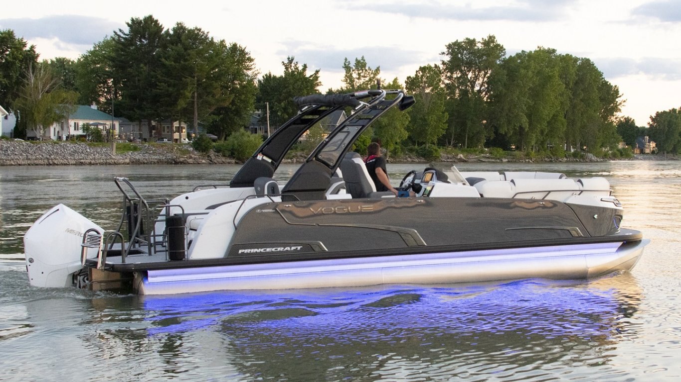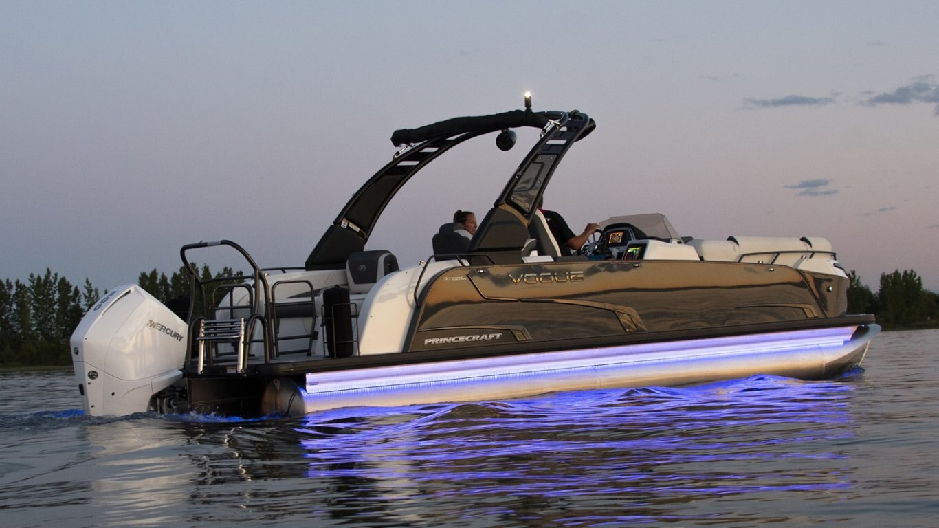 Vogue domed decal package (black chrome)…UE Sport Ice Edition including Sport Edition logo on both sides, premium upholstery textured vinyl, LED lighting on floor, bimini top, pontoon logs, speakers, and fixed cup holders Platinum Meteorite Edition including Platinum Edition logo on both sides, diamond premium upholstery textured vinyl, LED lighting on floor, bimini top, pontoon logs, speakers and fixed cup holders