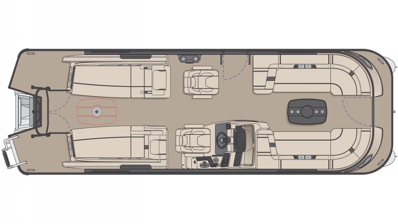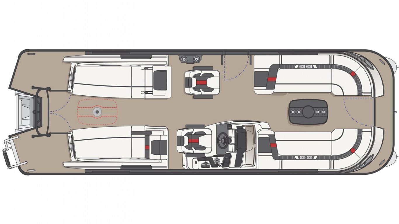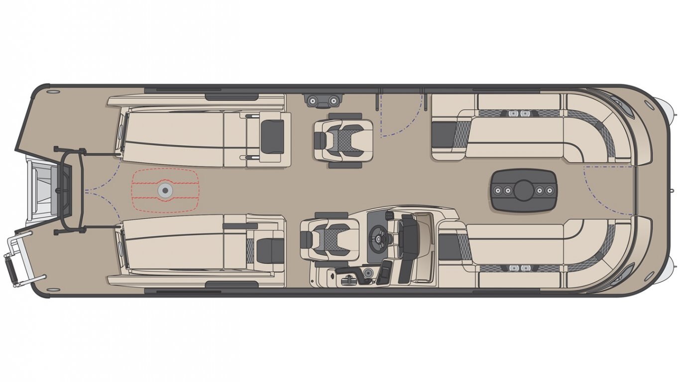 5052-H36 marine grade aluminum alloy 2 1/2" heavy-duty extruded Z-aluminum cross channels NMMA & Transport Canada certified APS style side panels Sealed pontoon bulkheads with top mounted air plug (25") V-shaped aluminum engine pod Select dark grey vinyl floor covering (Teak Supreme Solid Dark) Extruded aluminum full-length pontoon keels Extruded aluminum full-length pontoon skirting Stern molded corners Walk-thru rear gate with lift and lock hinges Walk-thru bow gate with lift and lock hinges Port side gate with lift and lock hinges (20") Extra large stern swim platform Bow fiberglass molded section with integrated LED lighting Stainless steel bow eye 4 stainless steel recessed cleats Rear gate holder Permanent gas tank of 110 L / 29 U.S. gal.