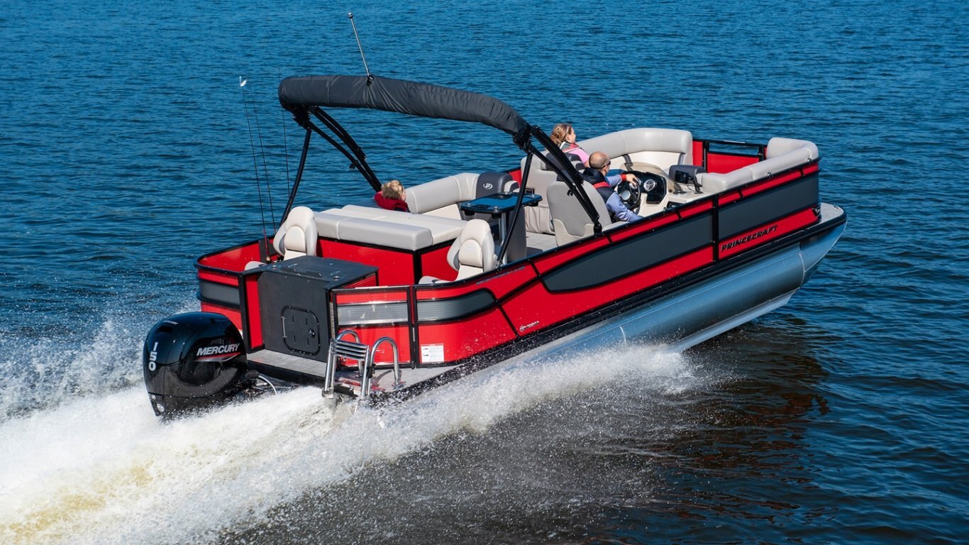5052-H36 marine grade aluminum alloy 2 1/2" heavy-duty extruded Z-aluminum cross channels NMMA & Transport Canada certified 1 1/4" anodized aluminum rails Sealed pontoon bulkheads with top mounted air plug (25") V-shaped aluminum engine pod Select dark grey vinyl floor covering (Teak Supreme Solid Dark) Extruded aluminum full-length pontoon keels Extruded aluminum full-length pontoon skirting Stern molded corners Walk-thru rear gate with lift and lock hinges Walk-thru bow gate with lift and lock hinges Port side gate with lift and lock hinges (24") Stern swim platform Stainless steel bow eye 4- 6" chromed deck cleats Permanent gas tank of 110 L / 29 U.S. gal.