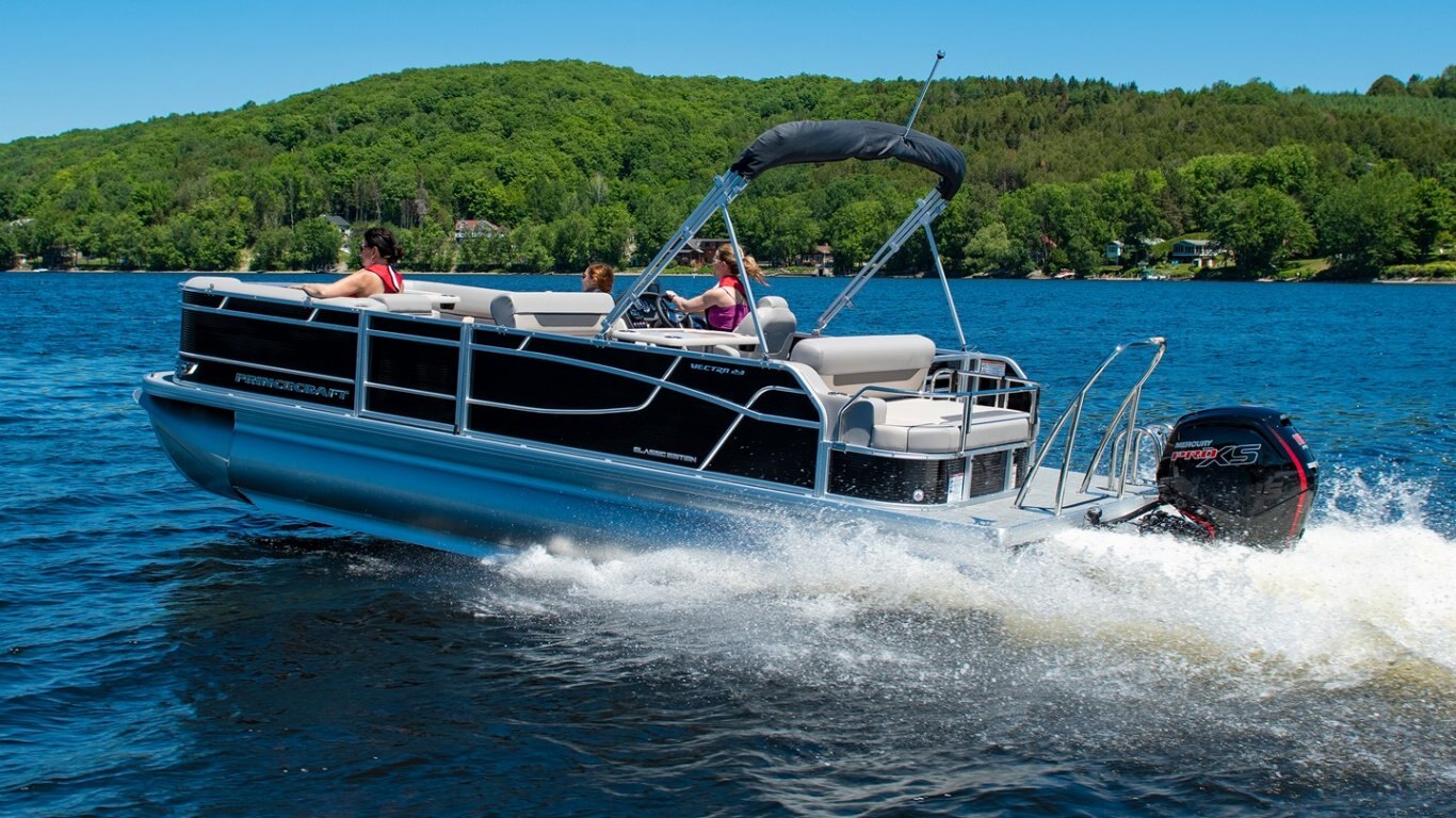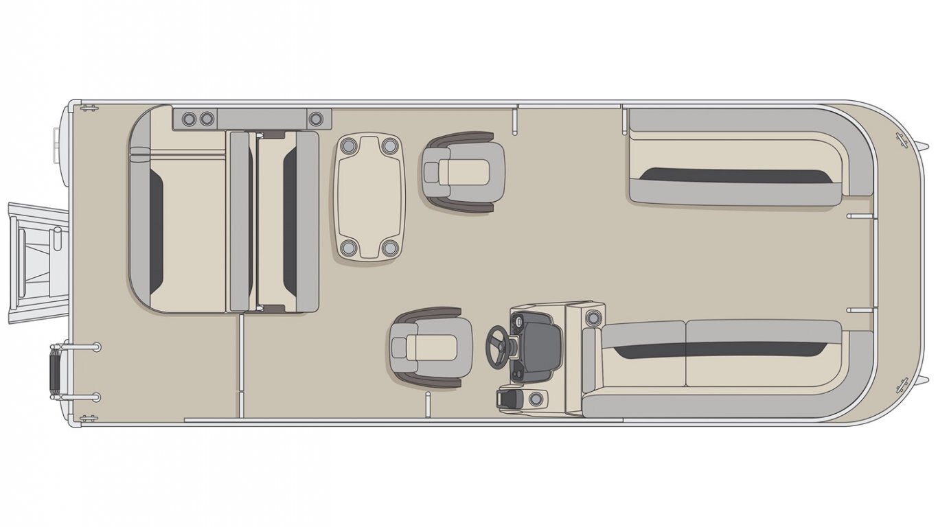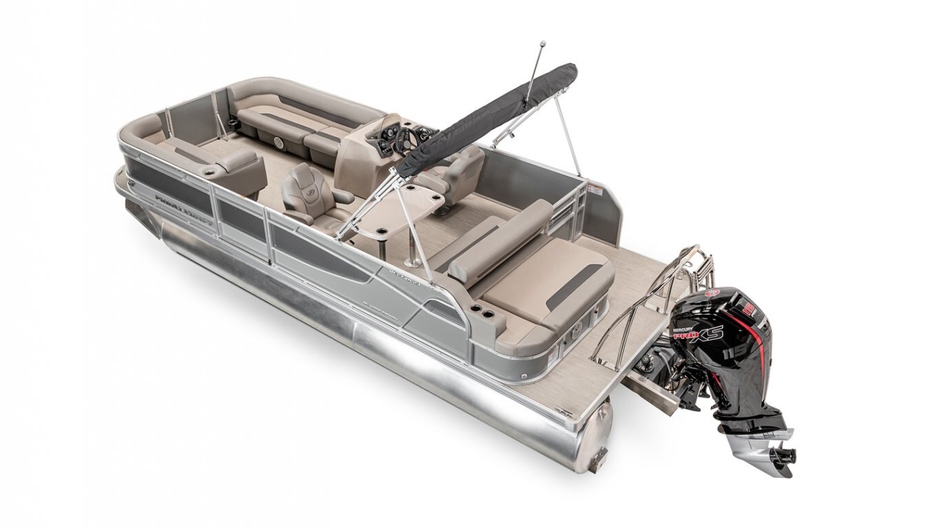 5052-H36 marine grade aluminum alloy 2 1/2" heavy-duty extruded Z-aluminum cross channels NMMA & Transport Canada certified 1 1/4" anodized aluminum rails Sealed pontoon bulkheads with top mounted air plug (25") V-shaped aluminum engine pod Select dark grey vinyl floor covering (Teak Supreme Solid Dark) Extruded aluminum full-length pontoon keels Extruded aluminum full-length pontoon skirting Stern molded corners Walk-thru rear gate with lift and lock hinges Walk-thru bow gate with lift and lock hinges Port side gate with lift and lock hinges (24") Stern swim platform Stainless steel bow eye 4- 6" chromed deck cleats Permanent gas tank of 110 L / 29 U.S. gal.