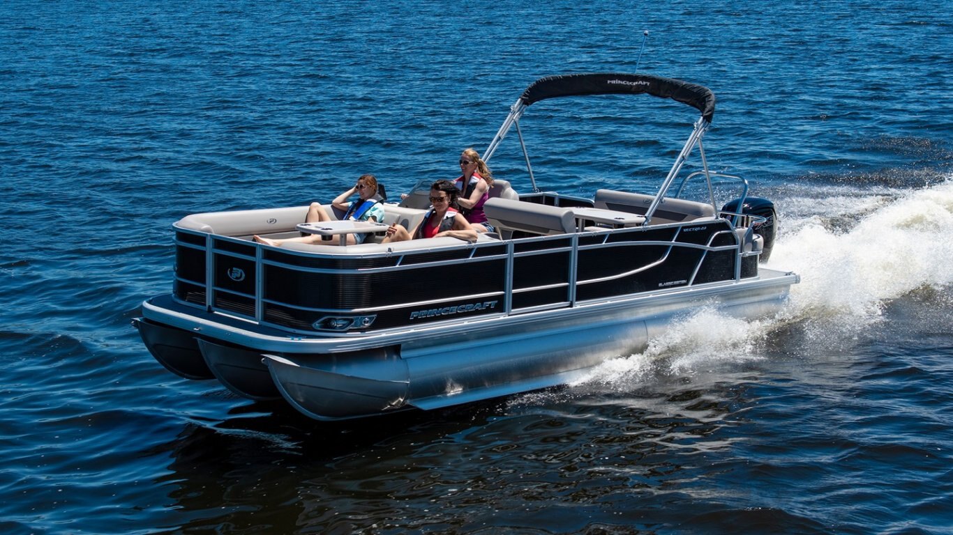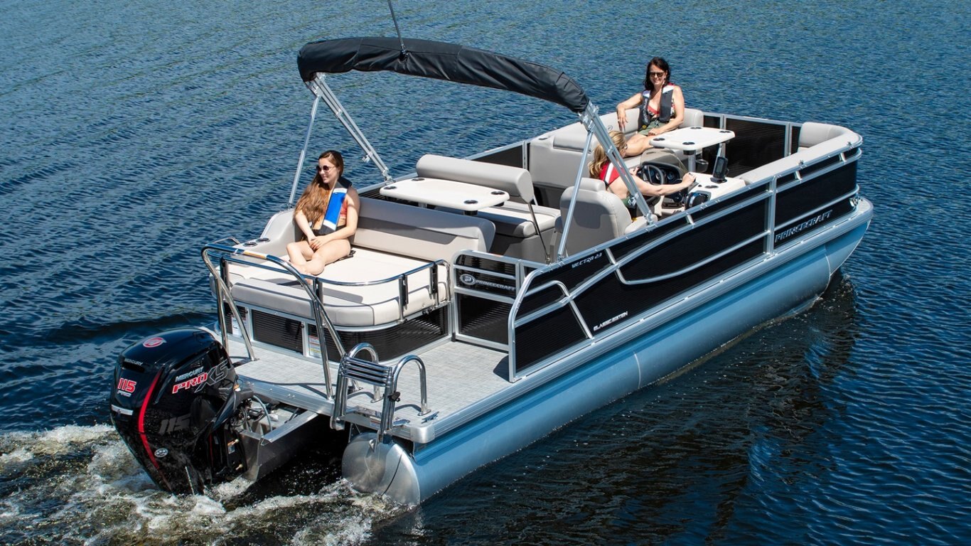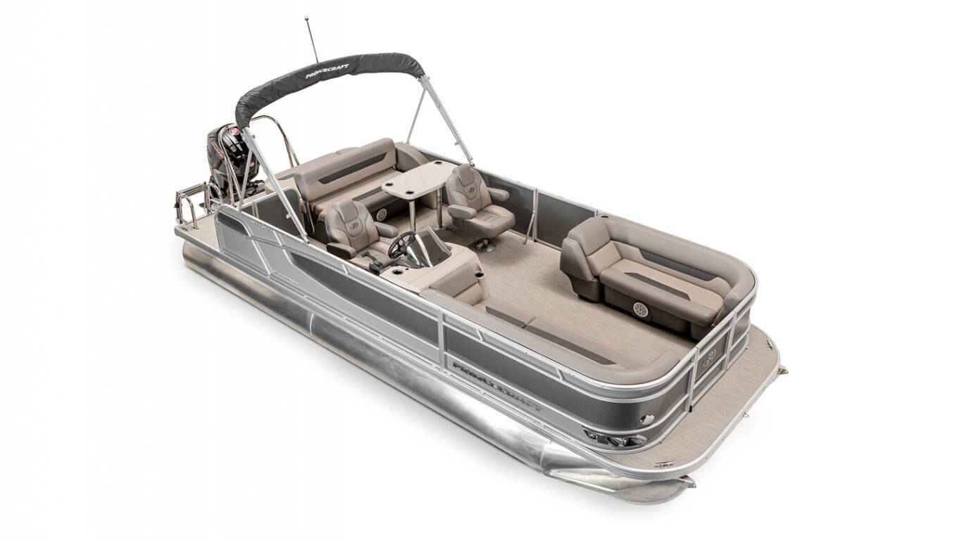5052-H36 marine grade aluminum alloy 2 1/2" heavy-duty extruded Z-aluminum cross channels NMMA & Transport Canada certified 1 1/4" anodized aluminum rails Sealed pontoon bulkheads with top mounted air plug (25") V-shaped aluminum engine pod Select dark grey vinyl floor covering (Teak Supreme Solid Dark) Extruded aluminum full-length pontoon keels Extruded aluminum full-length pontoon skirting Stern molded corners Walk-thru rear gate with lift and lock hinges Walk-thru bow gate with lift and lock hinges Port side gate with lift and lock hinges (24") Stern swim platform Stainless steel bow eye 4- 6" chromed deck cleats Permanent gas tank of 110 L / 29 U.S. gal.
