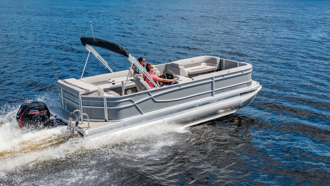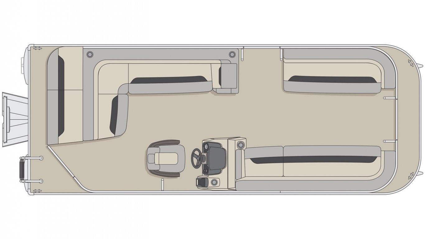 5052-H36 marine grade aluminum alloy 2 1/2" heavy-duty extruded Z-aluminum cross channels NMMA & Transport Canada certified 1 1/4" anodized aluminum rails Sealed pontoon bulkheads with top mounted air plug (25") V-shaped aluminum engine pod Select dark grey vinyl floor covering (Teak Supreme Solid Dark) Extruded aluminum full-length pontoon keels Extruded aluminum full-length pontoon skirting Stern molded corners Walk-thru rear gate with lift and lock hinges Walk-thru bow gate with lift and lock hinges Port side gate with lift and lock hinges (24") Stern swim platform Stainless steel bow eye 4- 6" chromed deck cleats