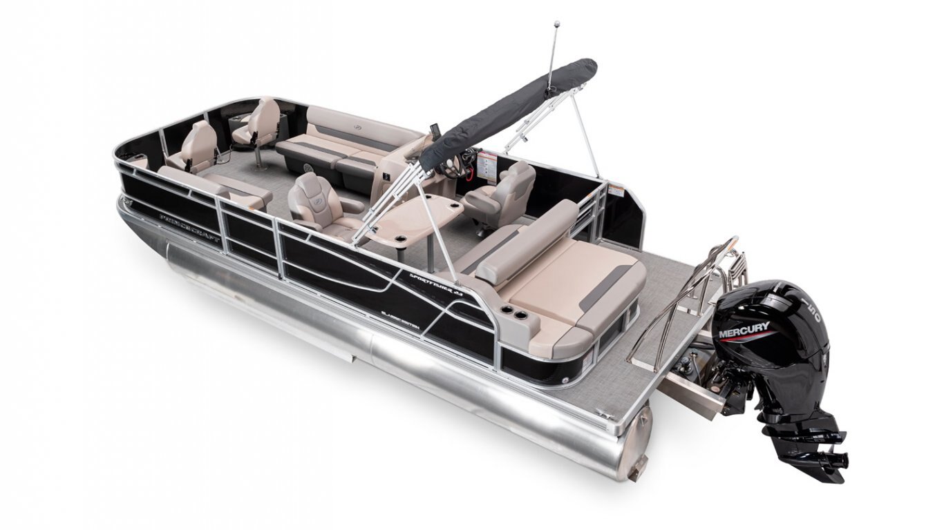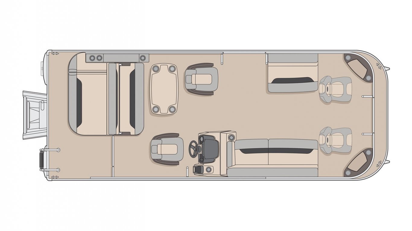 5052-H36 marine grade aluminum alloy 2 1/2" heavy-duty extruded Z-aluminum cross channels NMMA & Transport Canada certified 1 1/4" anodized aluminum rails Sealed pontoon bulkheads with top mounted air plug (25") V-shaped aluminum engine pod Select dark grey vinyl floor covering (Teak Supreme Solid Dark) Extruded aluminum full-length pontoon keels Extruded aluminum full-length pontoon skirting Stern molded corners Walk-thru rear gate with lift and lock hinges Walk-thru bow gate with lift and lock hinges Port side gate with lift and lock hinges (24") Stainless steel bow eye 4- 6" chromed deck cleats Permanent gas tank of 110 L / 29 U.S. gal.