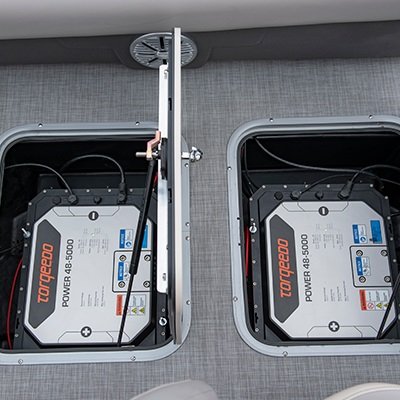 • 2 Torqeedo batteries 48V Power 48-5000 with 2 Torqeedo intelligent chargers (9h required for 0 - 100%) and 1 additional in-floor battery storage (Mandatory/Included in the package price with the Cruise 12.0 RL)