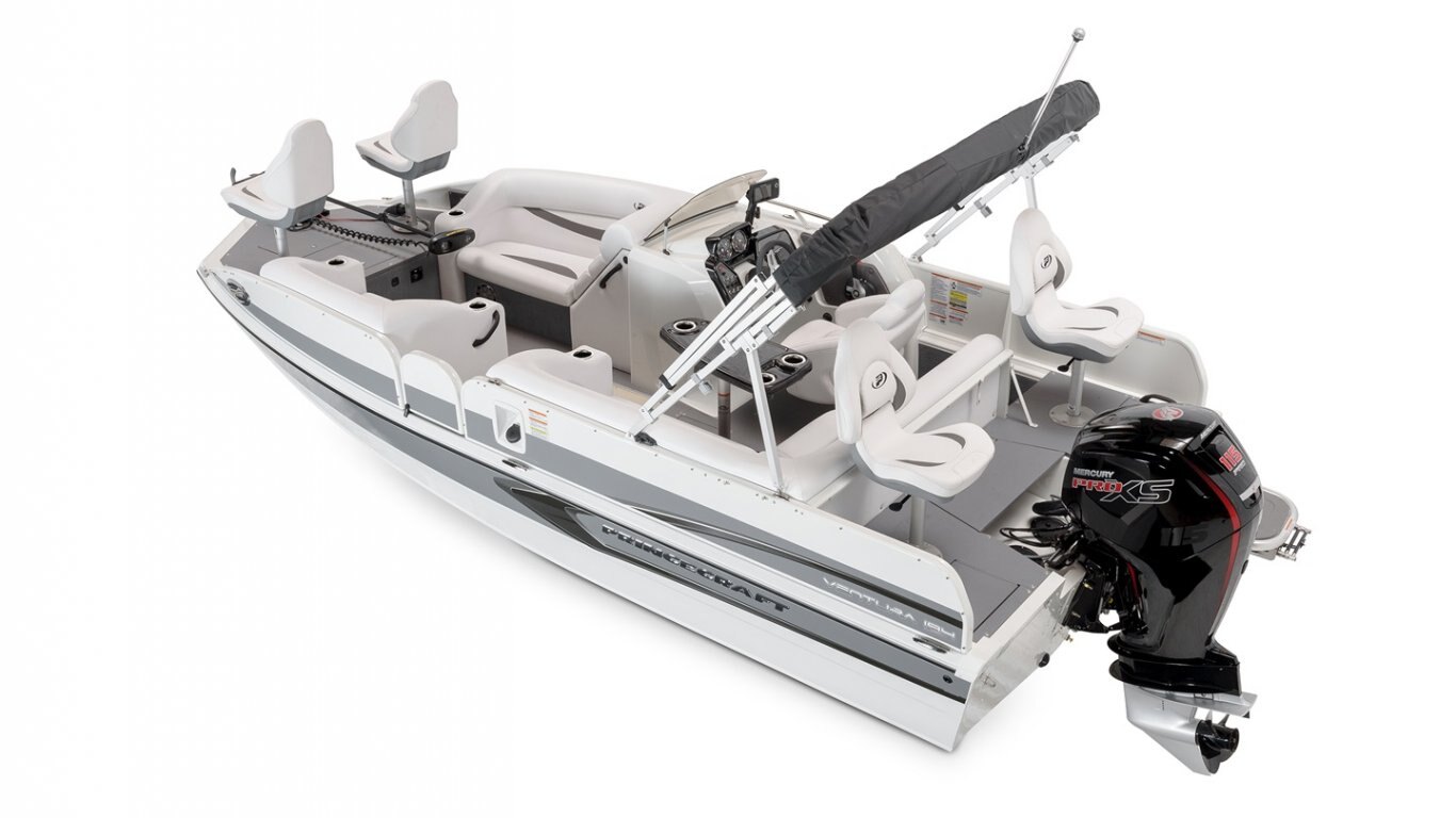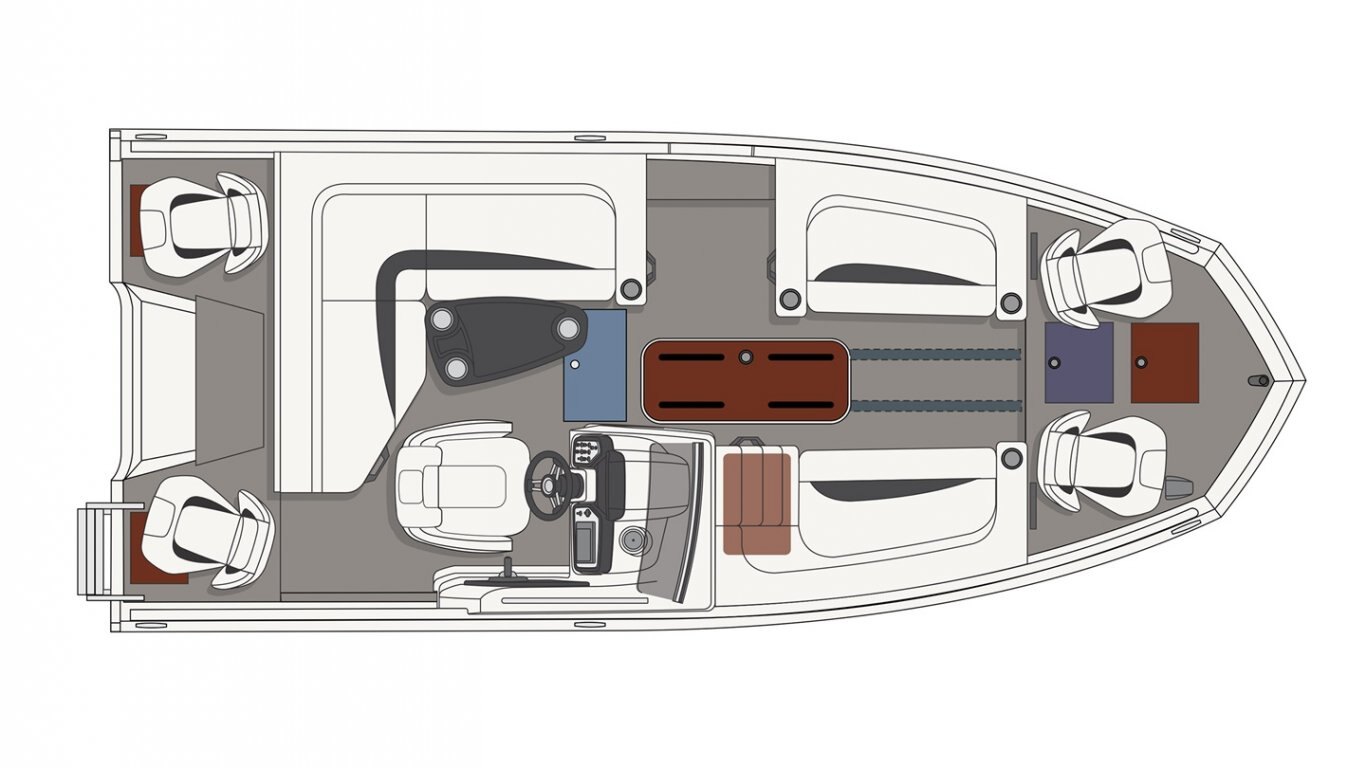 This 19’-2’’ aluminum deck boat can comfortably sit up to 8 (10 in the USA) and be powered by an engine ranging from 115 to 150 HP. With its 174 L (46 U.S. gal.) gas tank, its chaise lounge, its 4 folding seats, a large electric-filled aerated livewell, and a lockable rod storage compartment, it is the ideal deck boat to go fishing or just cruising!