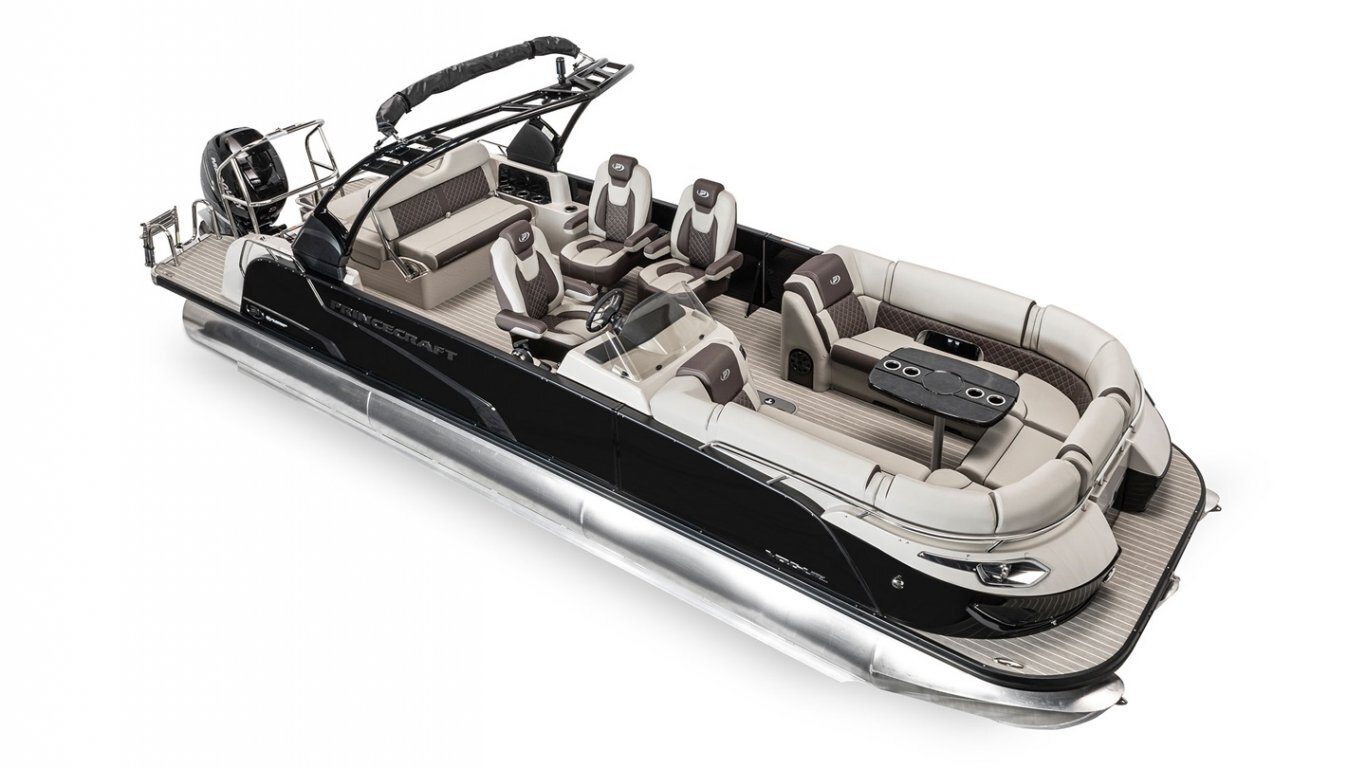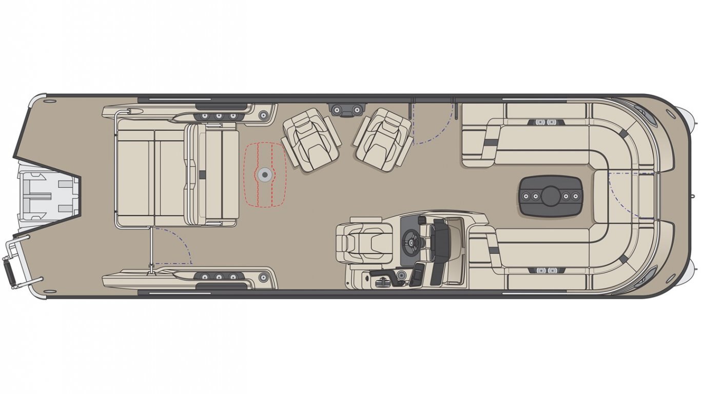 This 27’-11’’ pontoon features all the comfort and convenience you enjoy at home… and more. New automative-style raised helm console including a SIMRAD Go7 multifunction touchscreen with VesselView Link allowing instrumentation display, GPS functions, and sonar (that replaces the standard gauges) and a wireless smartphone charger; new cup holder modules and USB ports integrated into the padding; new integrated trash storage compartment; new folding table; oversized stern swim platform and boarding ladder. Without forgetting the RL design including a multi-position seat module, an integrated cooler and privacy enclosure, and safety railing around the rear seat. Have a party with up to 13 friends or enjoy your favorite water sports in the greatest luxury. Rig your pontoon with an engine from 150 up to 450 HP with the standard Performance Configuration and get ready for some serious fun!