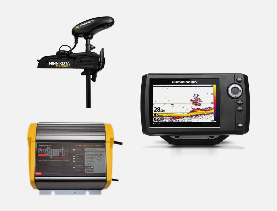 Fish and trolling package Humminbird/Minnkota including Minn Kota® 55 PD V2 trolling motor (12 volts, 54", 55 lb. peak thrust) with bracket, Sonar/ GPS Humminbird Helix 5 G3 with RAM mount (the bathymetric depth maps are not included) and onboard charger 12 V (ProSport 6)